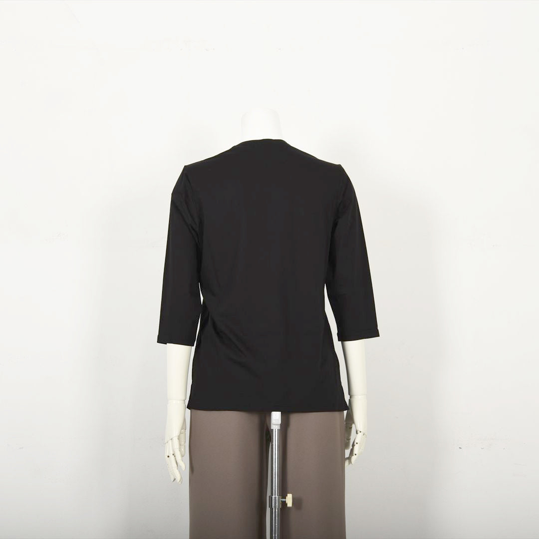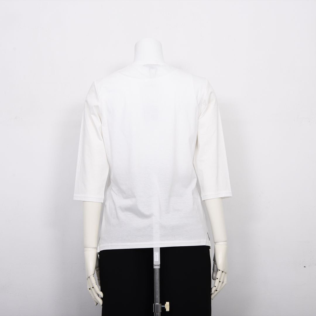 適度なフィット感で着心地がよいですね。とてもやわらかい肌ざわりです。Vネックのコンパクトさも1枚で着るのにちょうどいいと思います。着丈はヒップが隠れるくらい。袖丈はヒジがすっぽり隠れる7分袖。(158cm/40号)