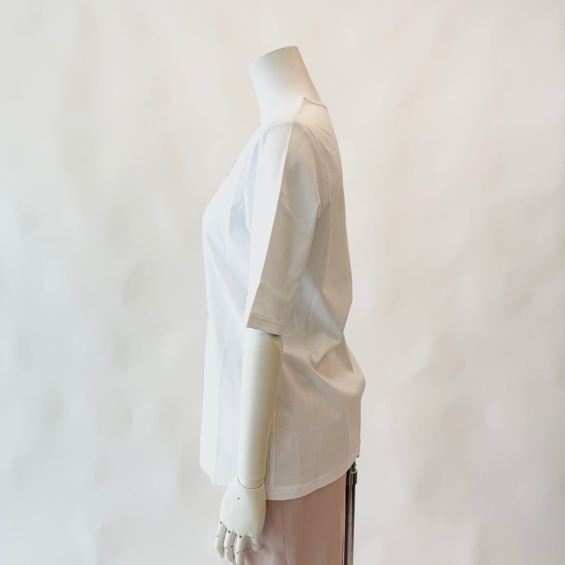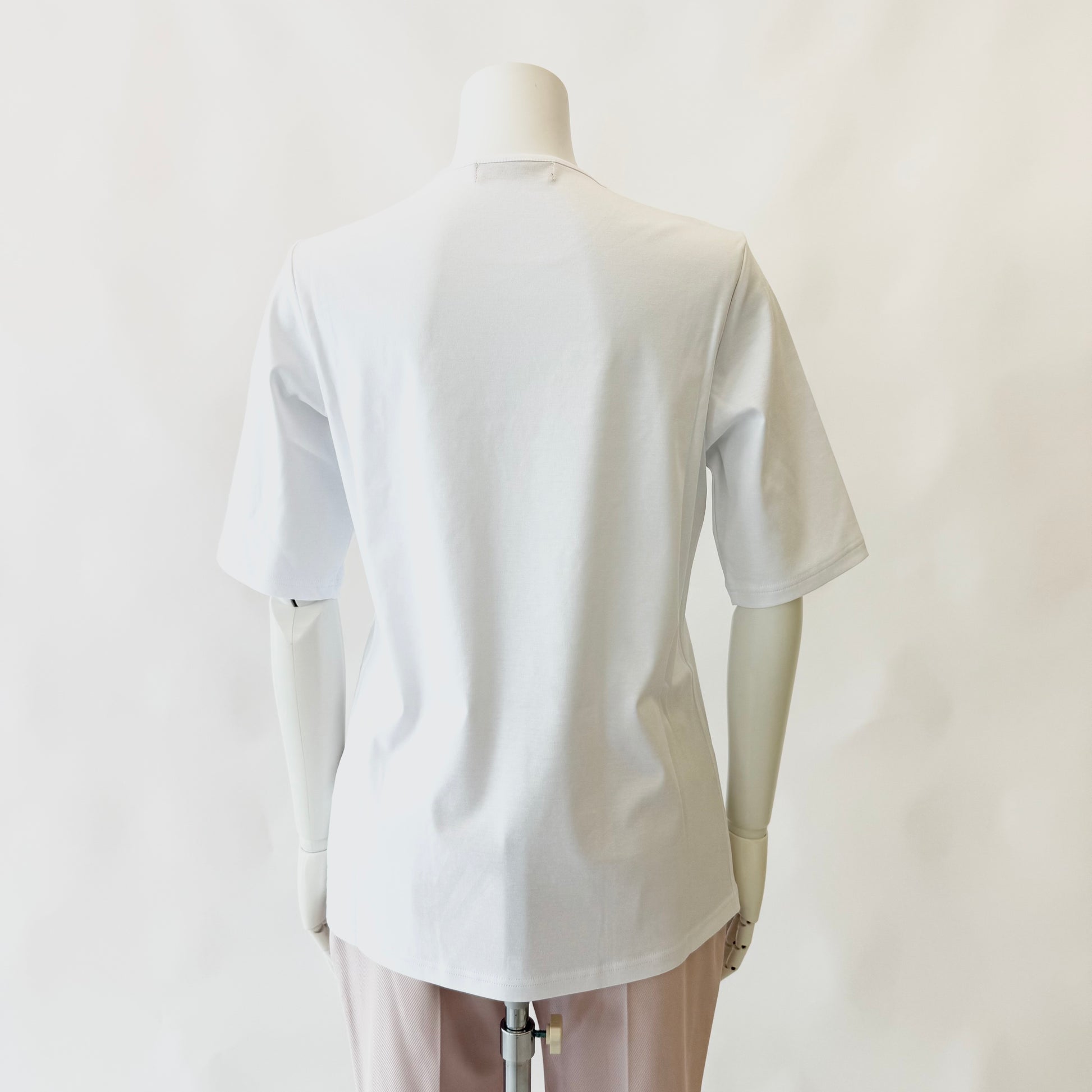 程よいネックのあき具合で1枚はもちろん、シャツやブラウスのインナーとしてもロングランで活躍します。