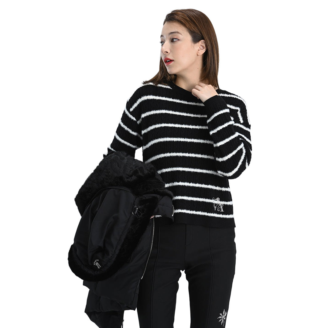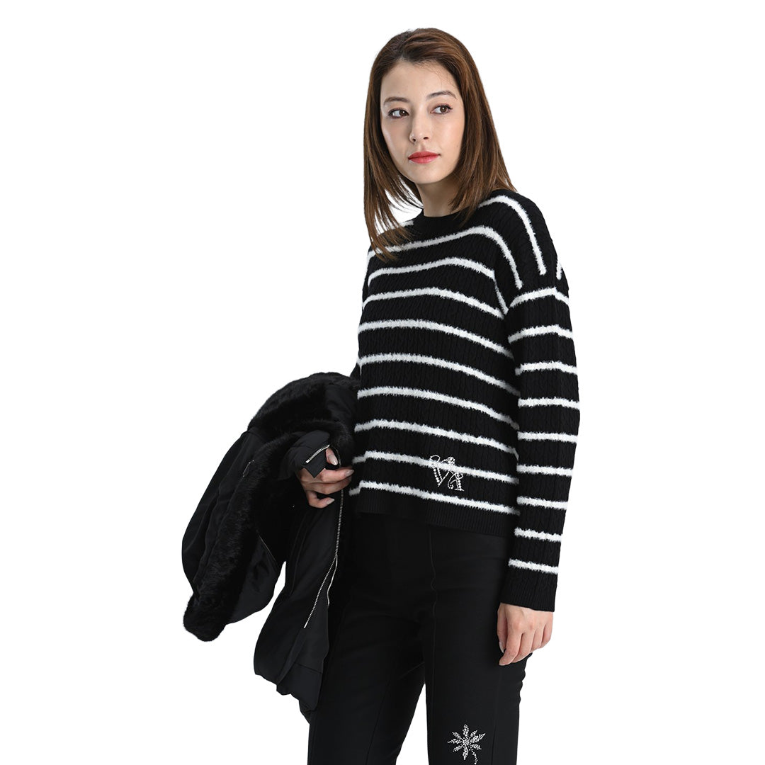 クラシックなケーブル編みのデザインにボーダー柄を合わせてカジュアル感を演出。