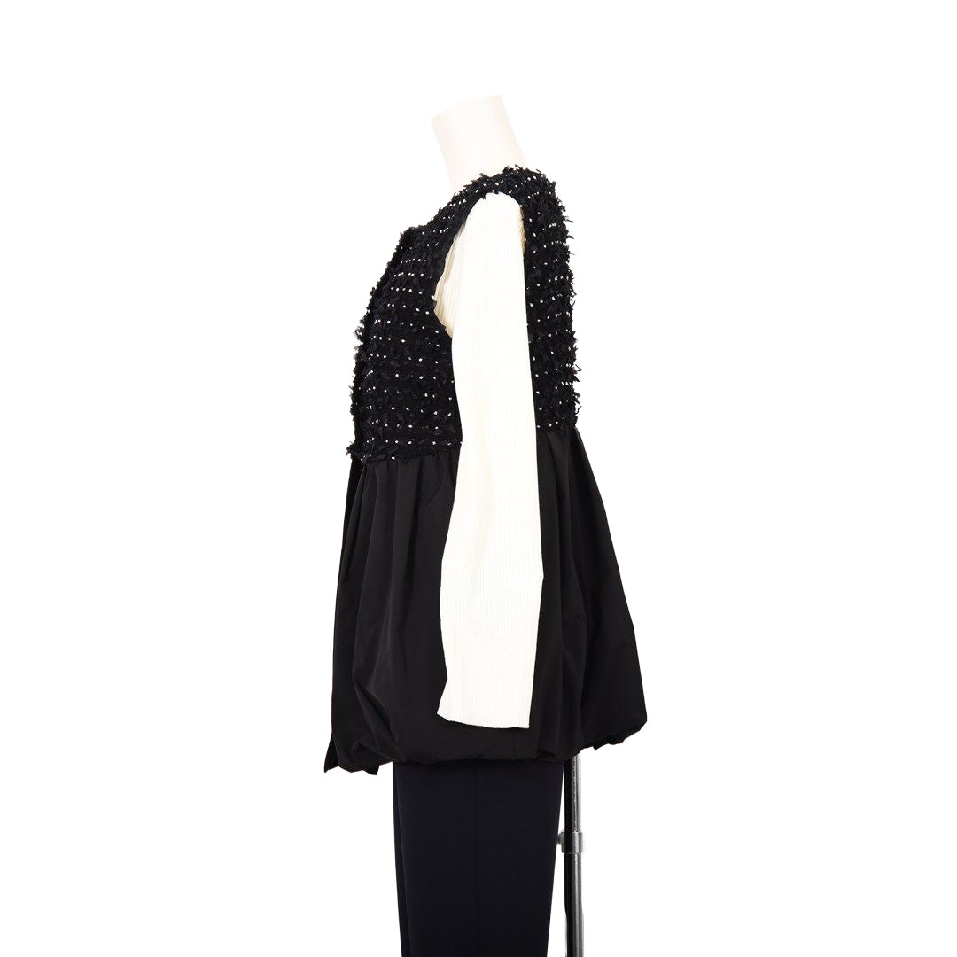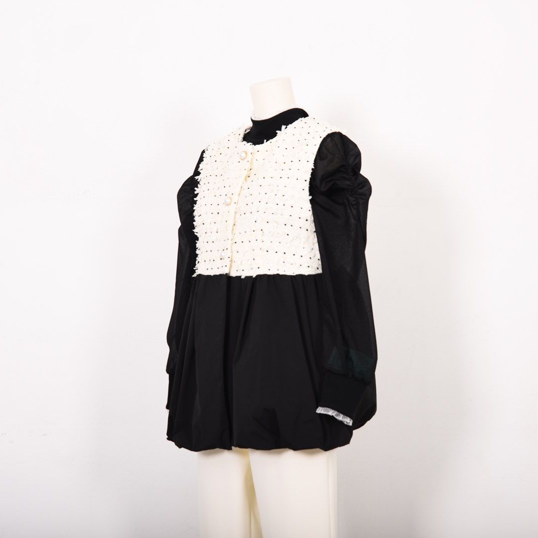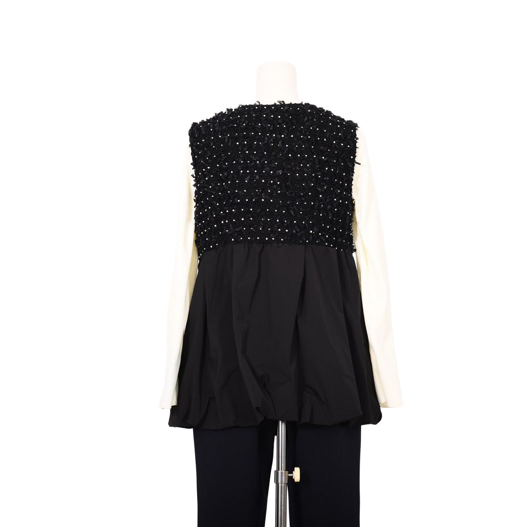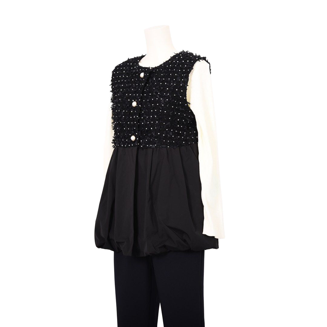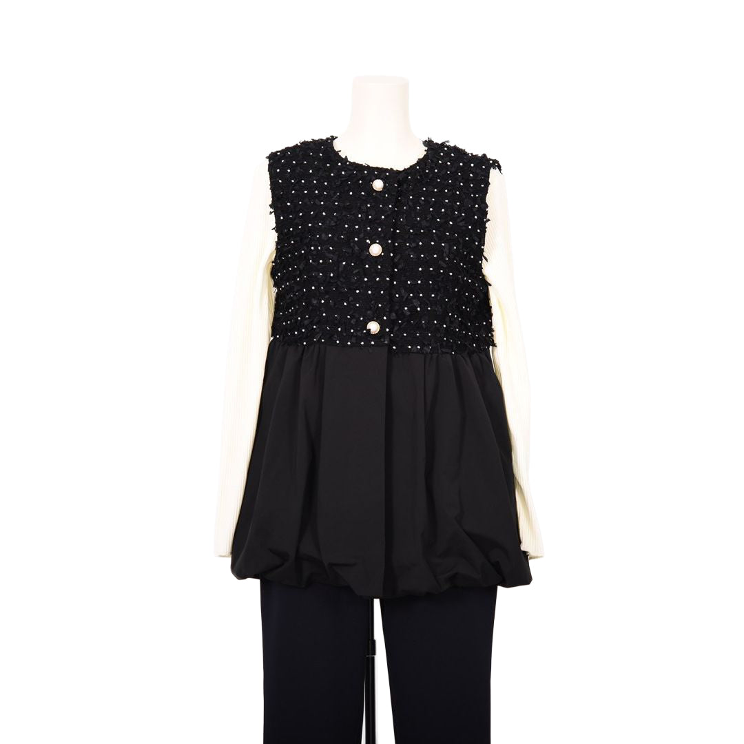 ふんわりやわらかなポンポン生地に異素材のタフタをドッキングしたベスト。
