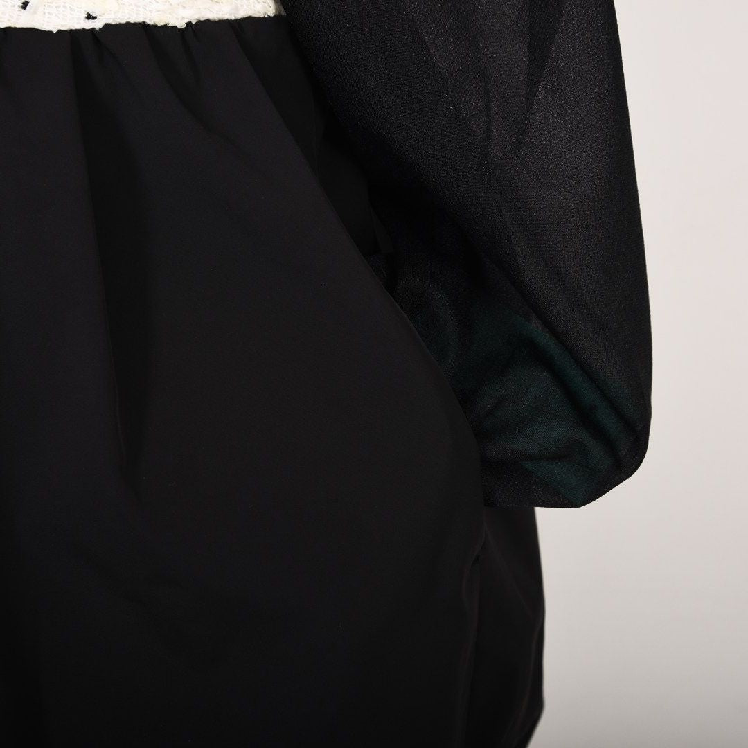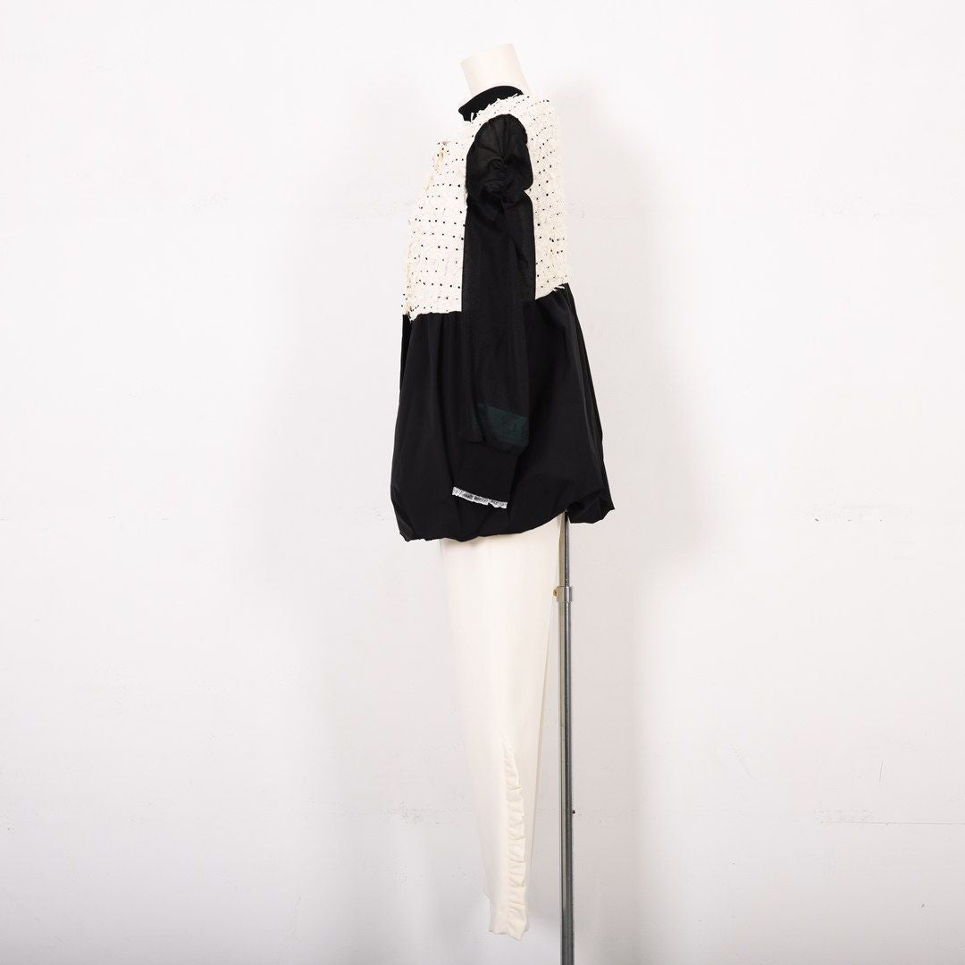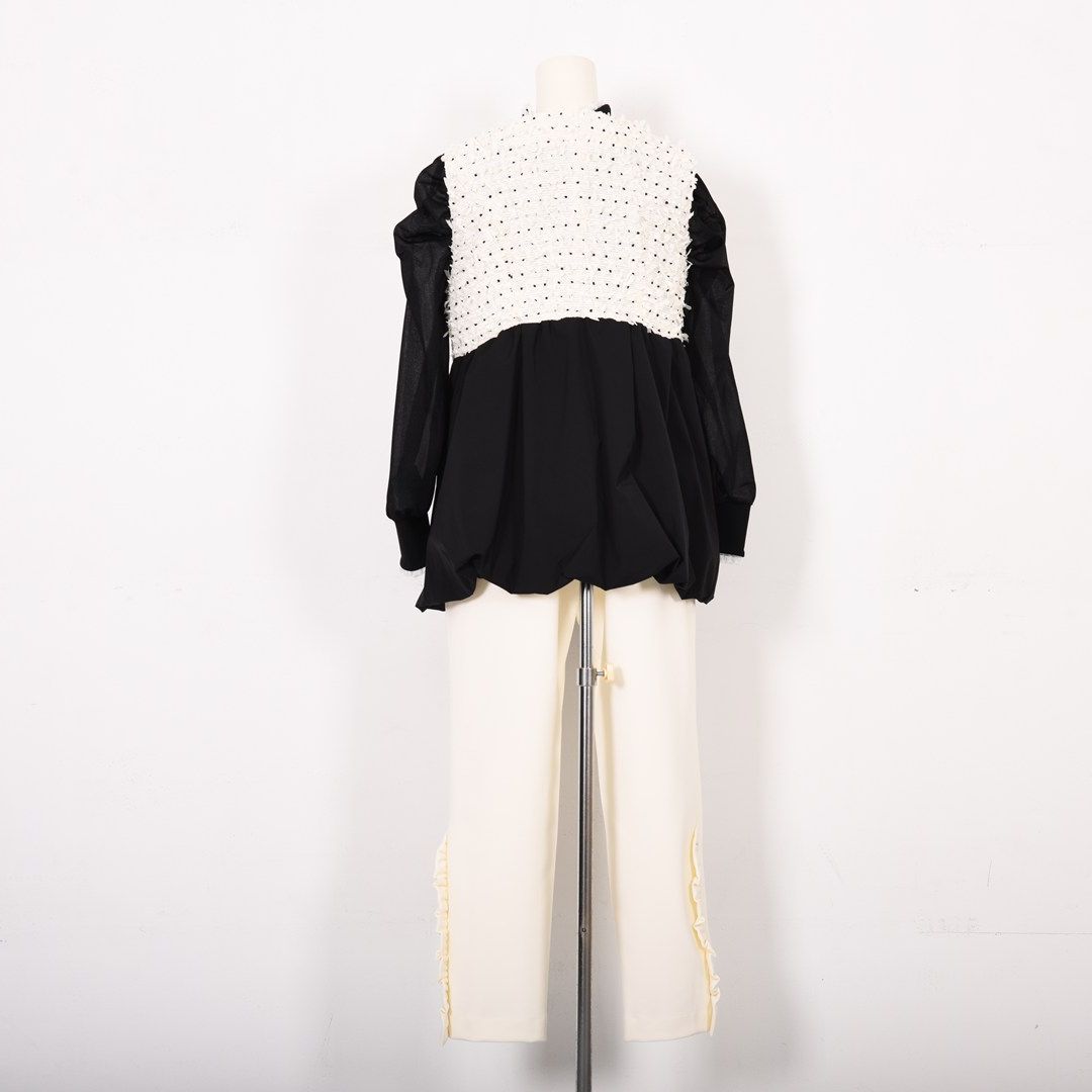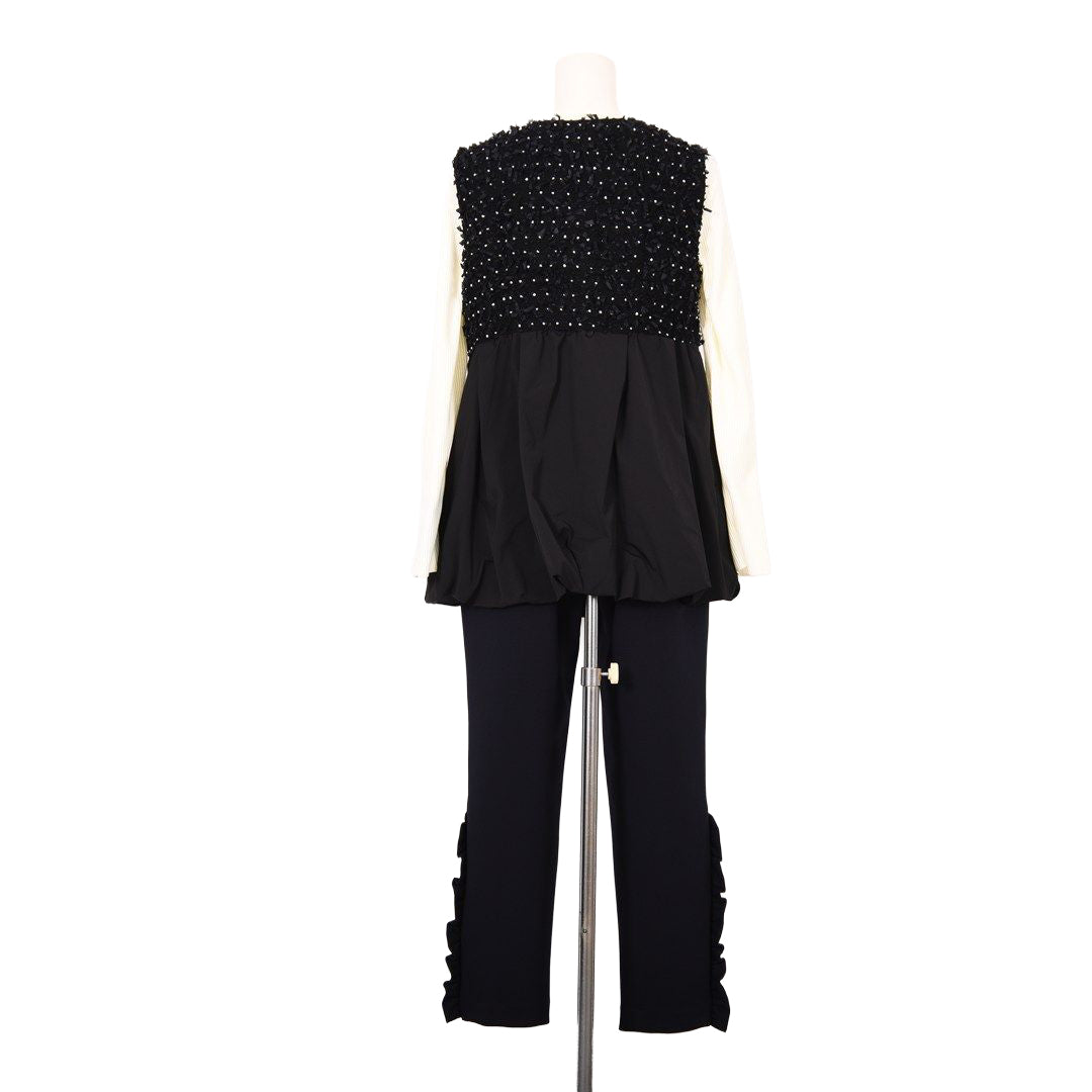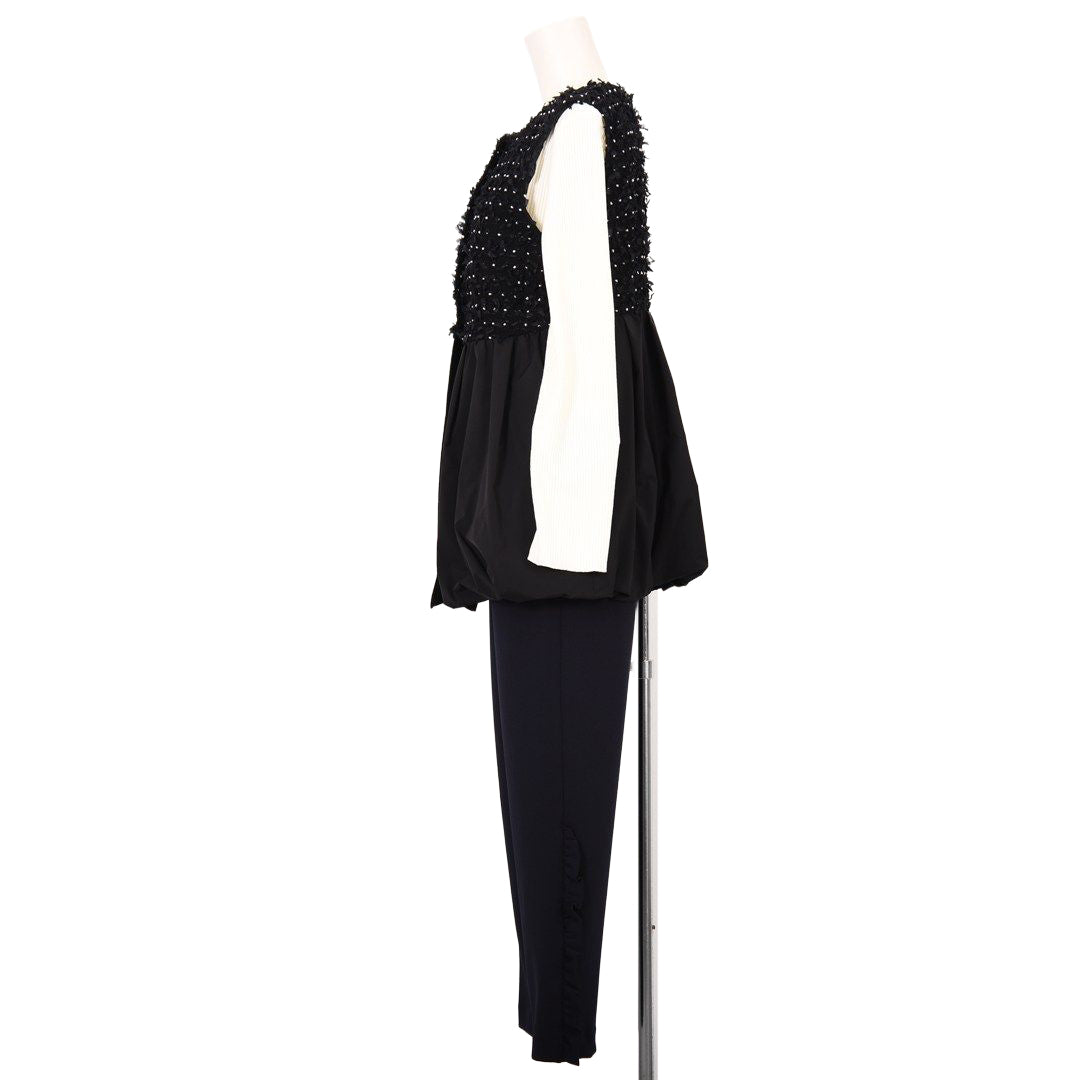 ふんわりやわらかなポンポン生地に異素材のタフタをドッキングしたベスト。
