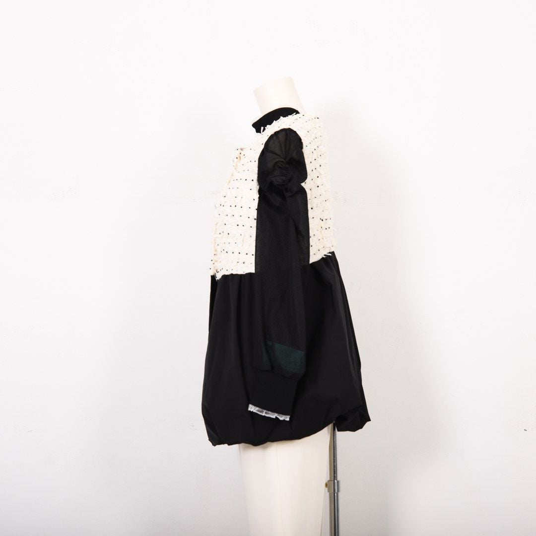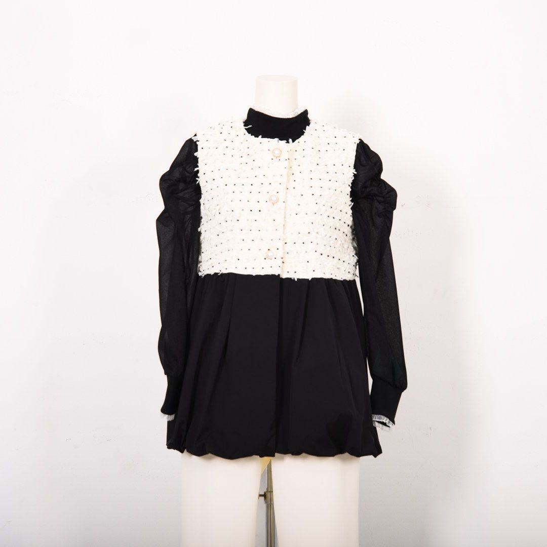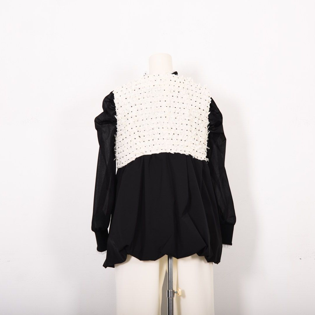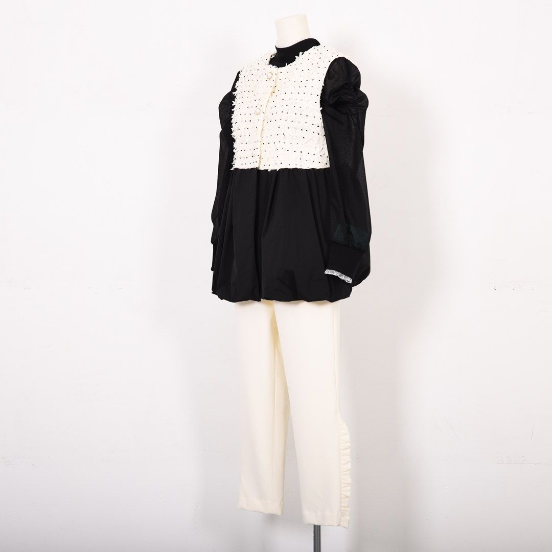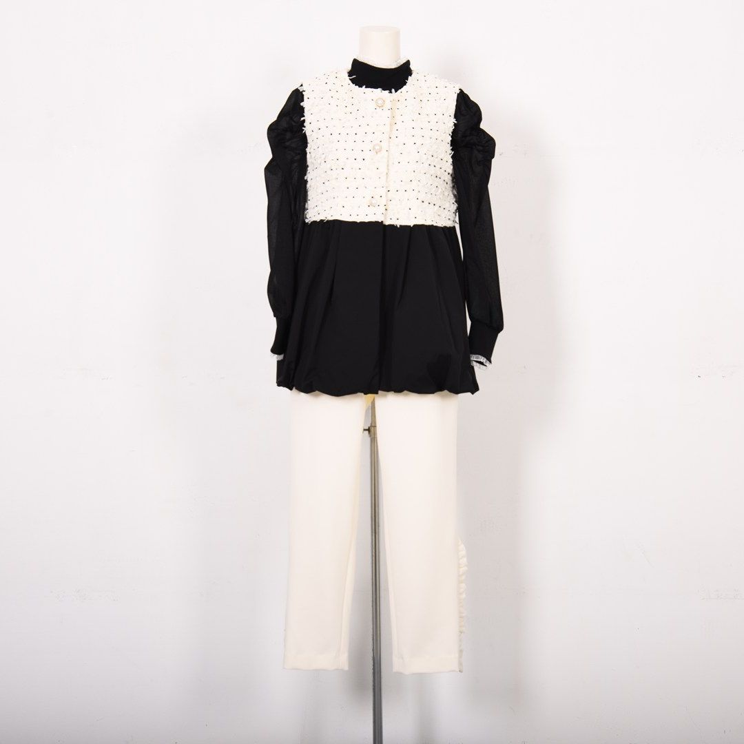 ふんわりやわらかなポンポン生地に異素材のタフタをドッキングしたベスト。