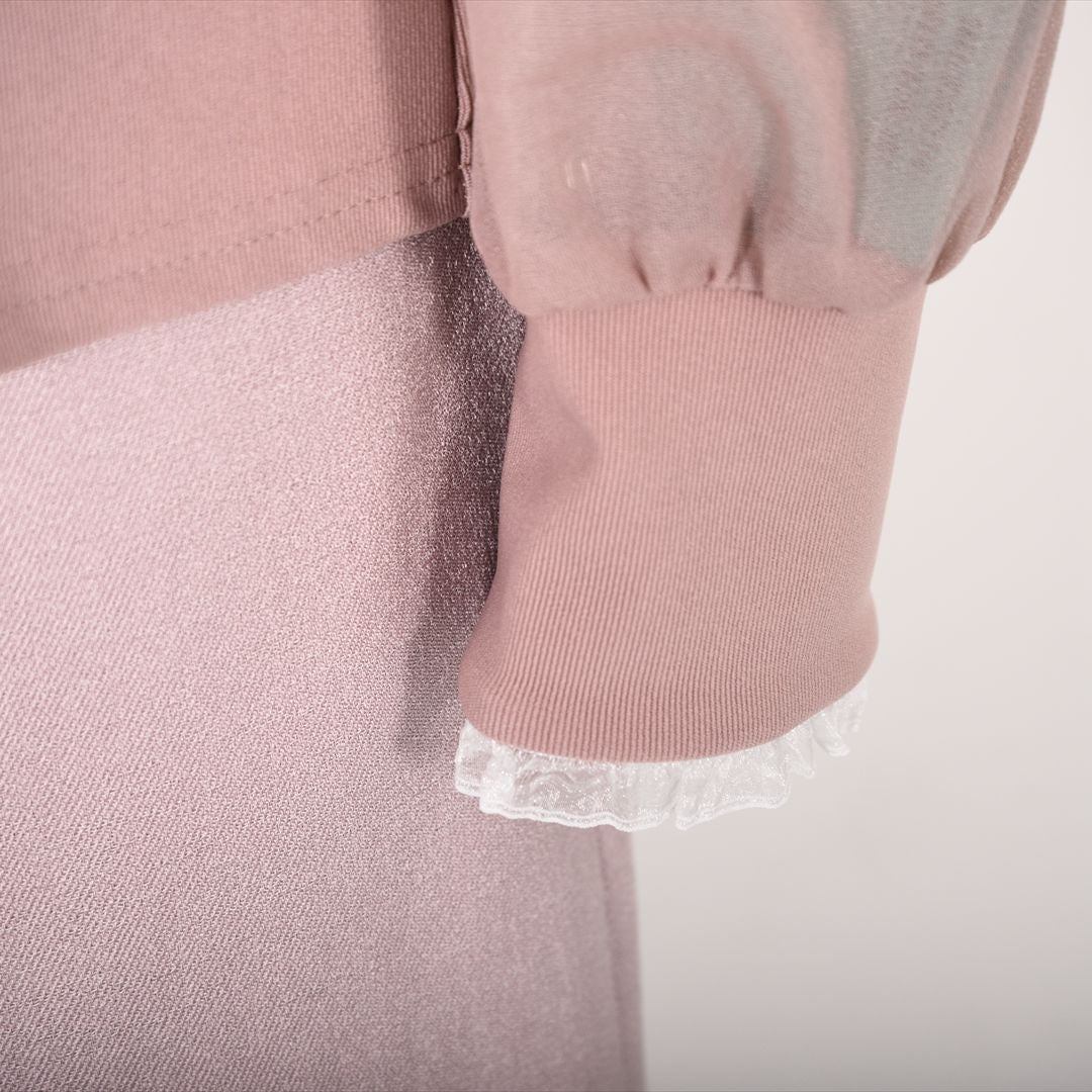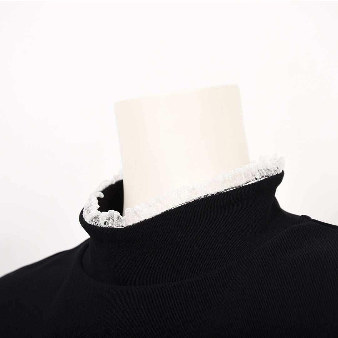 衿ぐりにや袖口にフリルをあしらってフェミニンな1枚に。