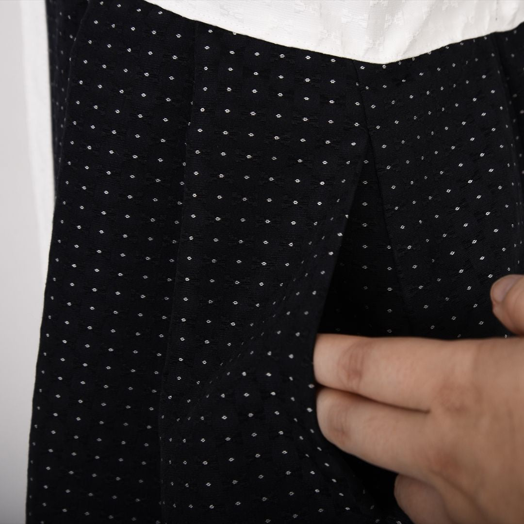 バックウエストにゴムをたっぷりと加えて甘めなディテールをプラス。