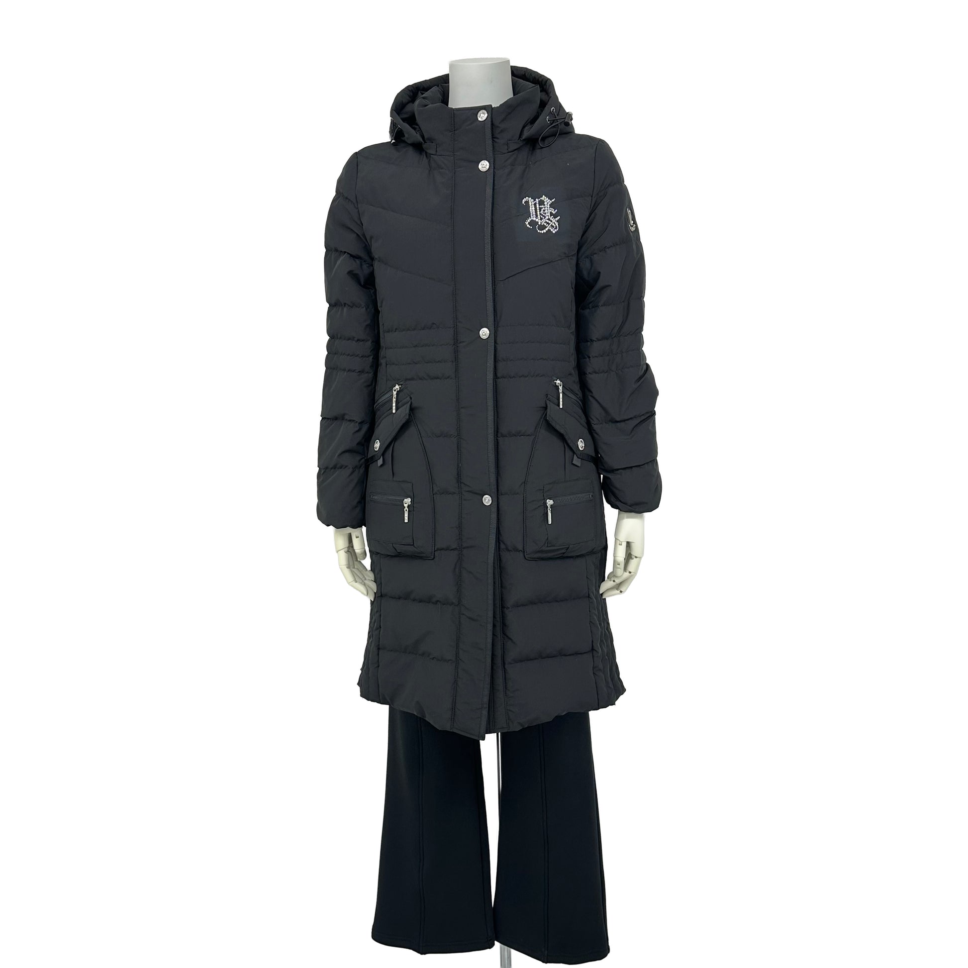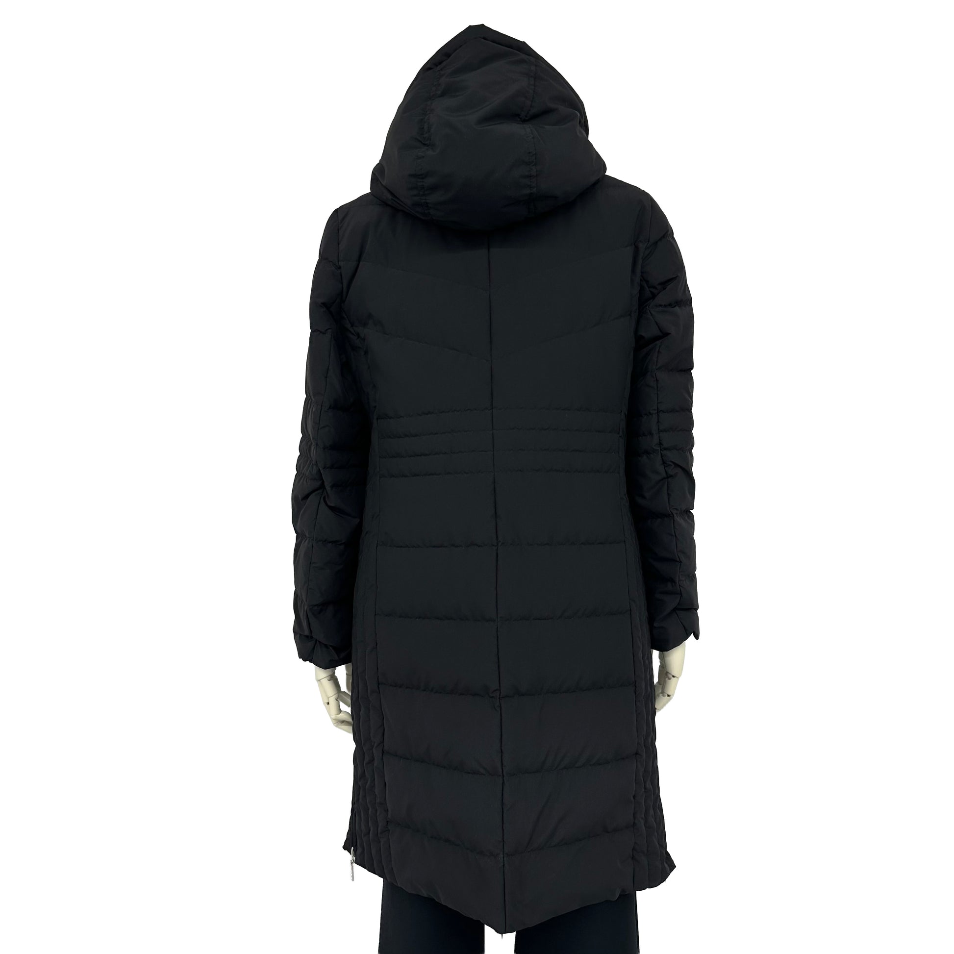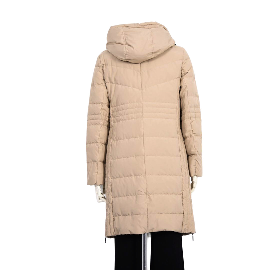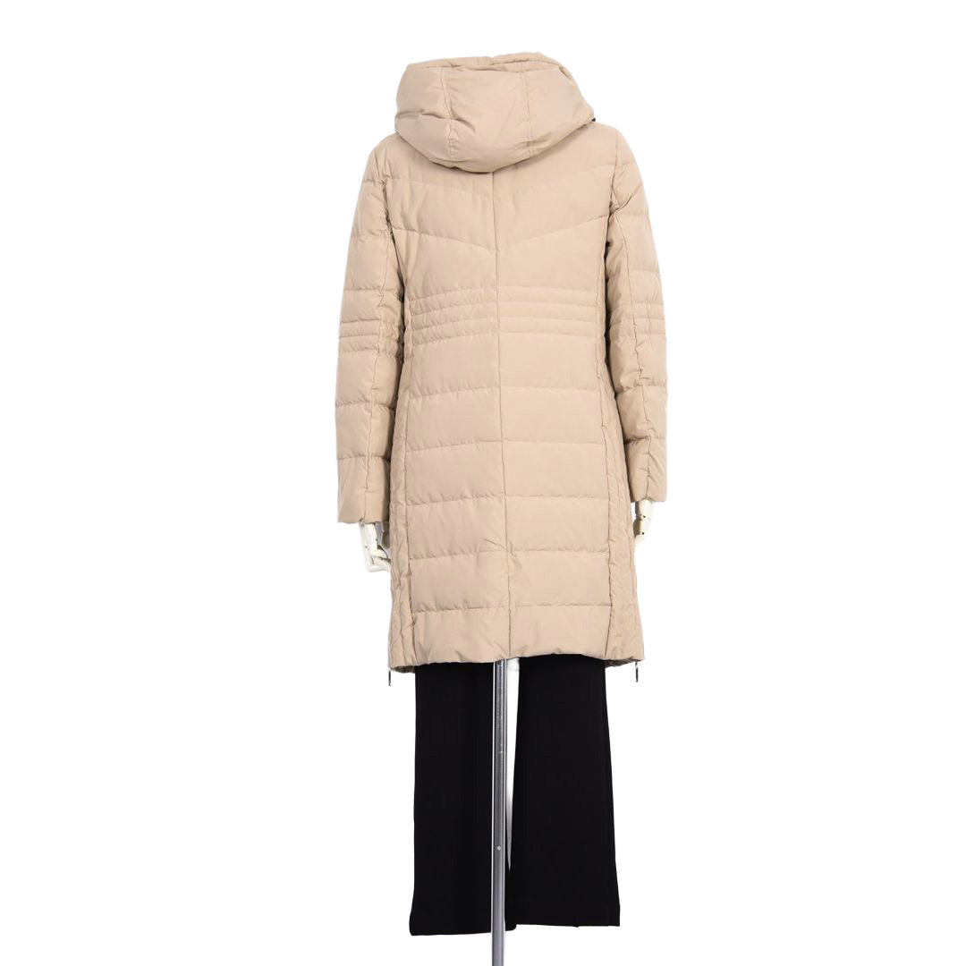 完全防寒している気分です♪しっかりと包まれている感じがとても安心ですね。ダウン量もちょうどいいので中にニットや厚手のインナーも着られそうです。着丈はヒザくらいのロング丈。(158cm/40号)