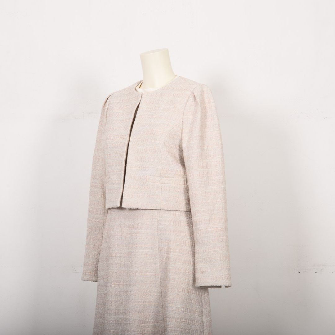 優しい配色のカラーツイード生地です。ややストレッチ性があり中肉厚の軽やかな素材です。