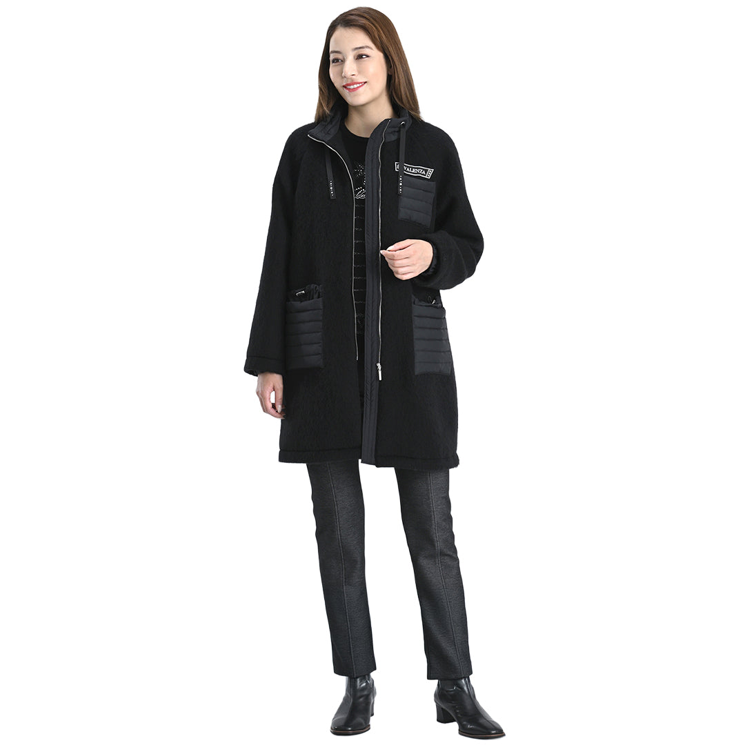 ファスナーなので簡単に羽織りやすいですね。フードがなくても中綿入りのスタンドカラーが首元を守ってくれる感じがします。ラグラン袖なので着心地もラクでインナーを着込んでもスッキリ見えすると思います。着丈は太ももにかかるくらいのロング丈。(158cm/40号)