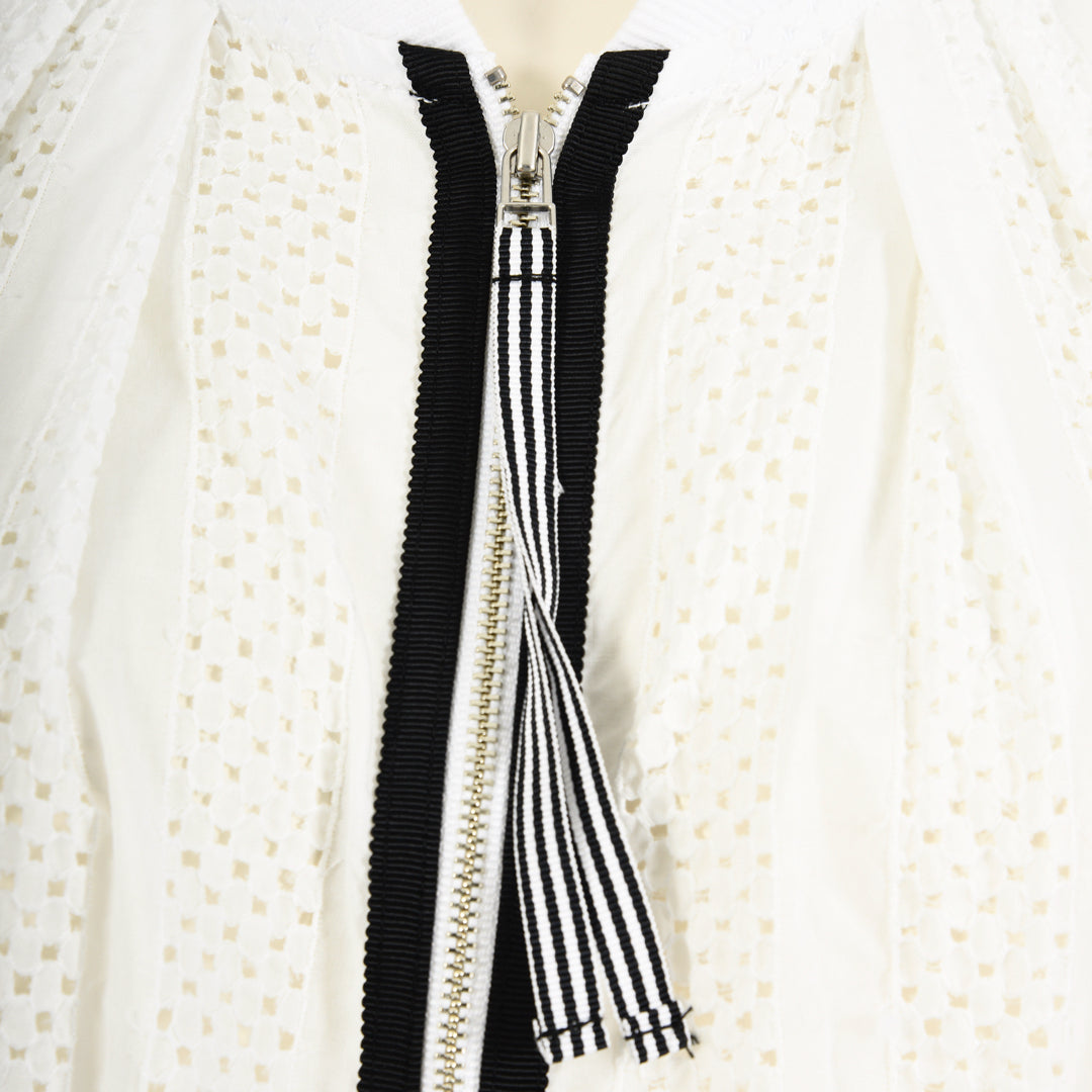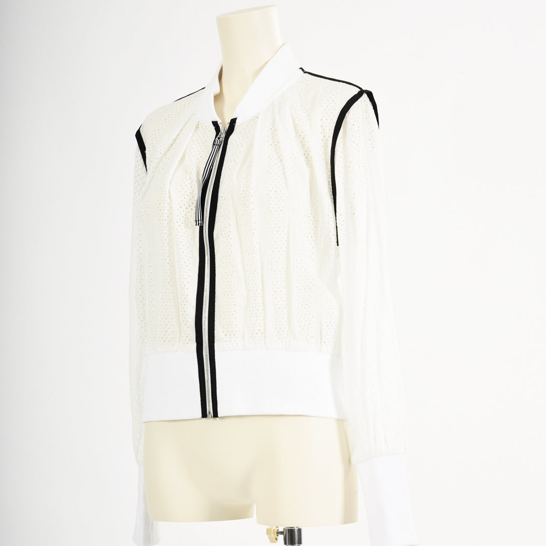 ストライプ柄のレースが甘すぎない大人カジュアルを演出してくれるレースブルゾン。すっきりとした着丈で、あらゆるボトムスとも相性抜群です。