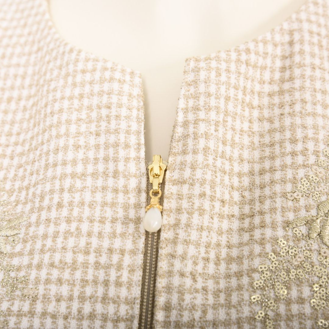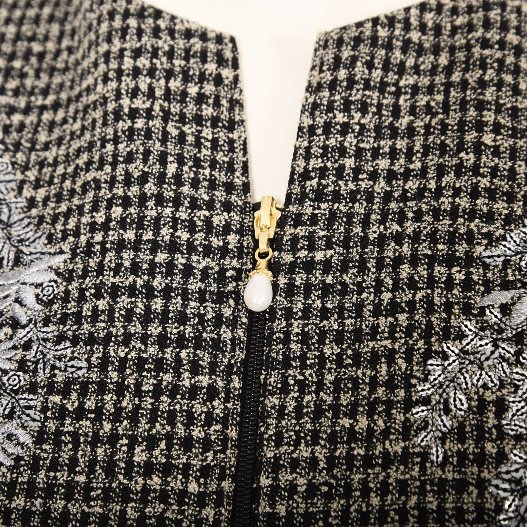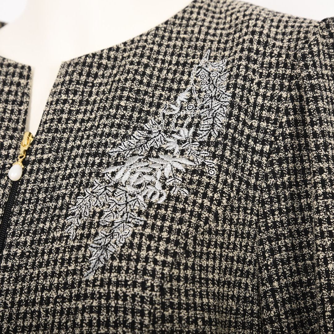 表地:ポリエステル70%,レーヨン30%、別布:ポリエステル100%、刺繍糸:ポリエステル78%,ナイロン22%、装飾:スパンコール使用、裏地:複合繊維ポリエステル54%,ポリエステル46% |
