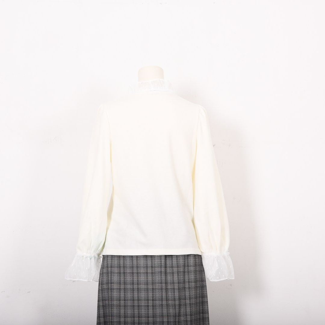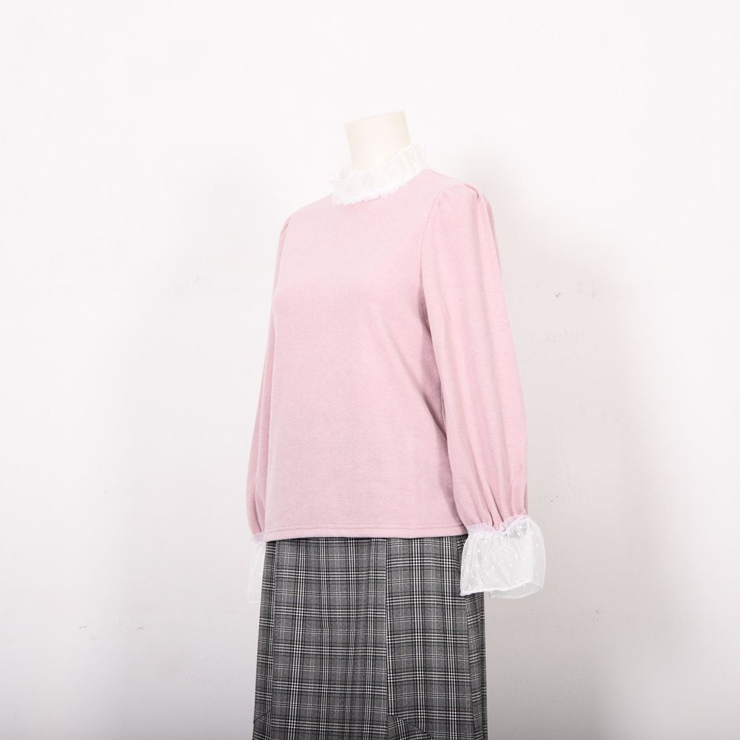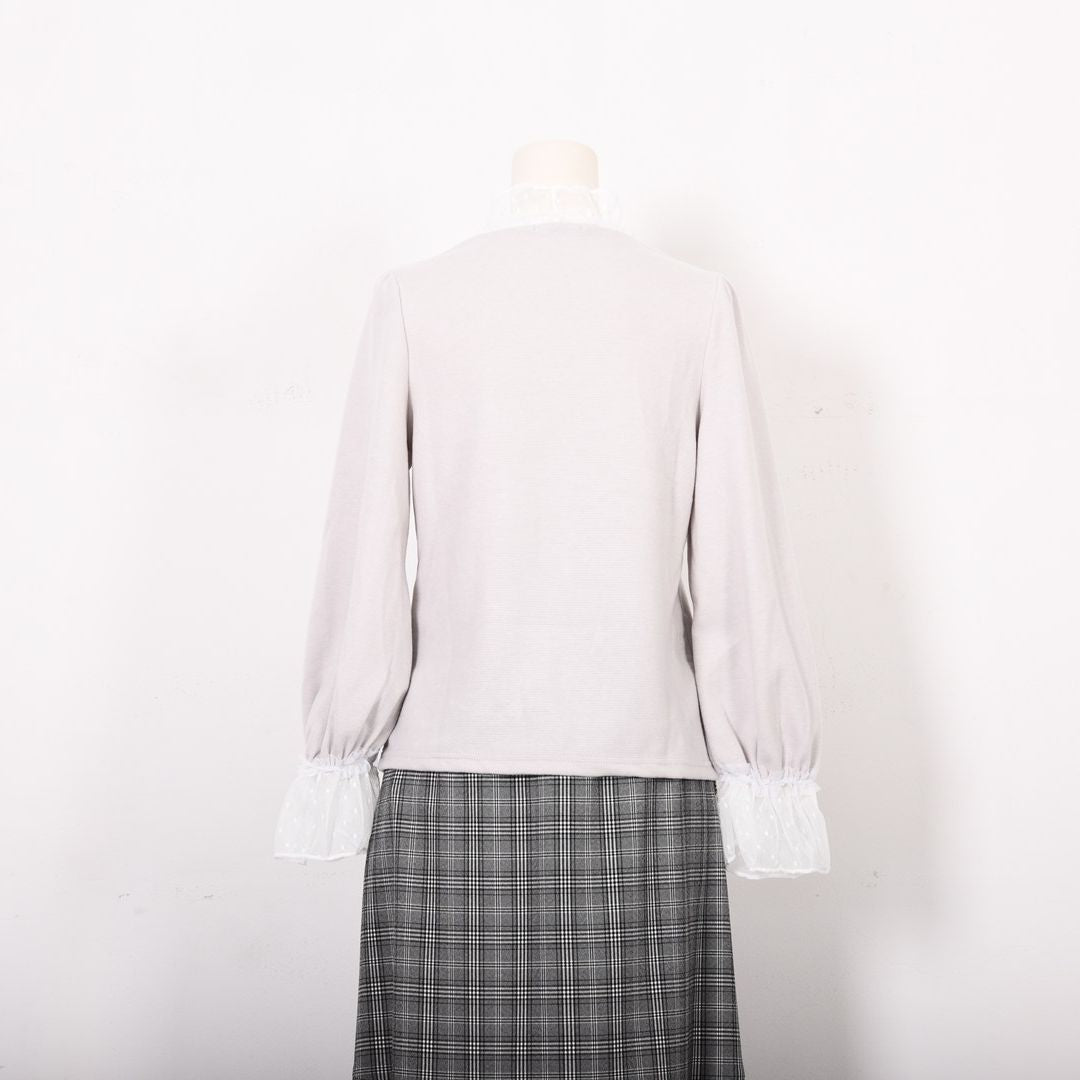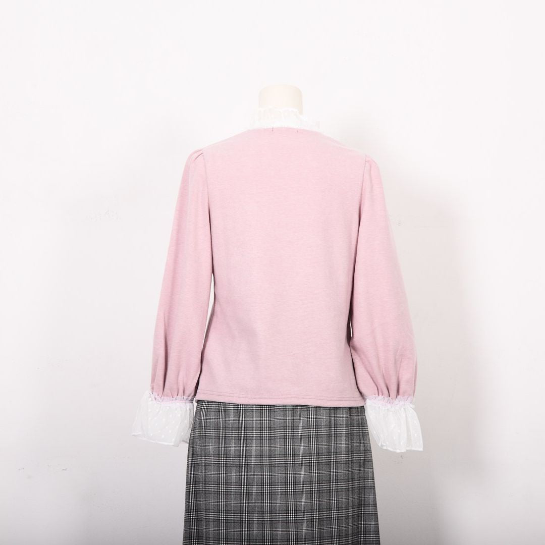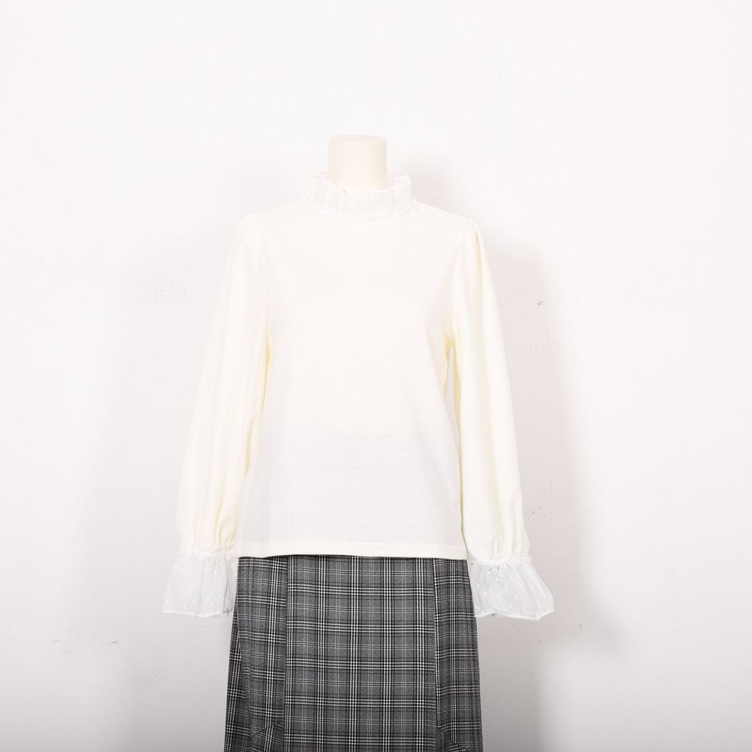 ふんわりとした衿元や袖口フリルが甘さをプラスします。
