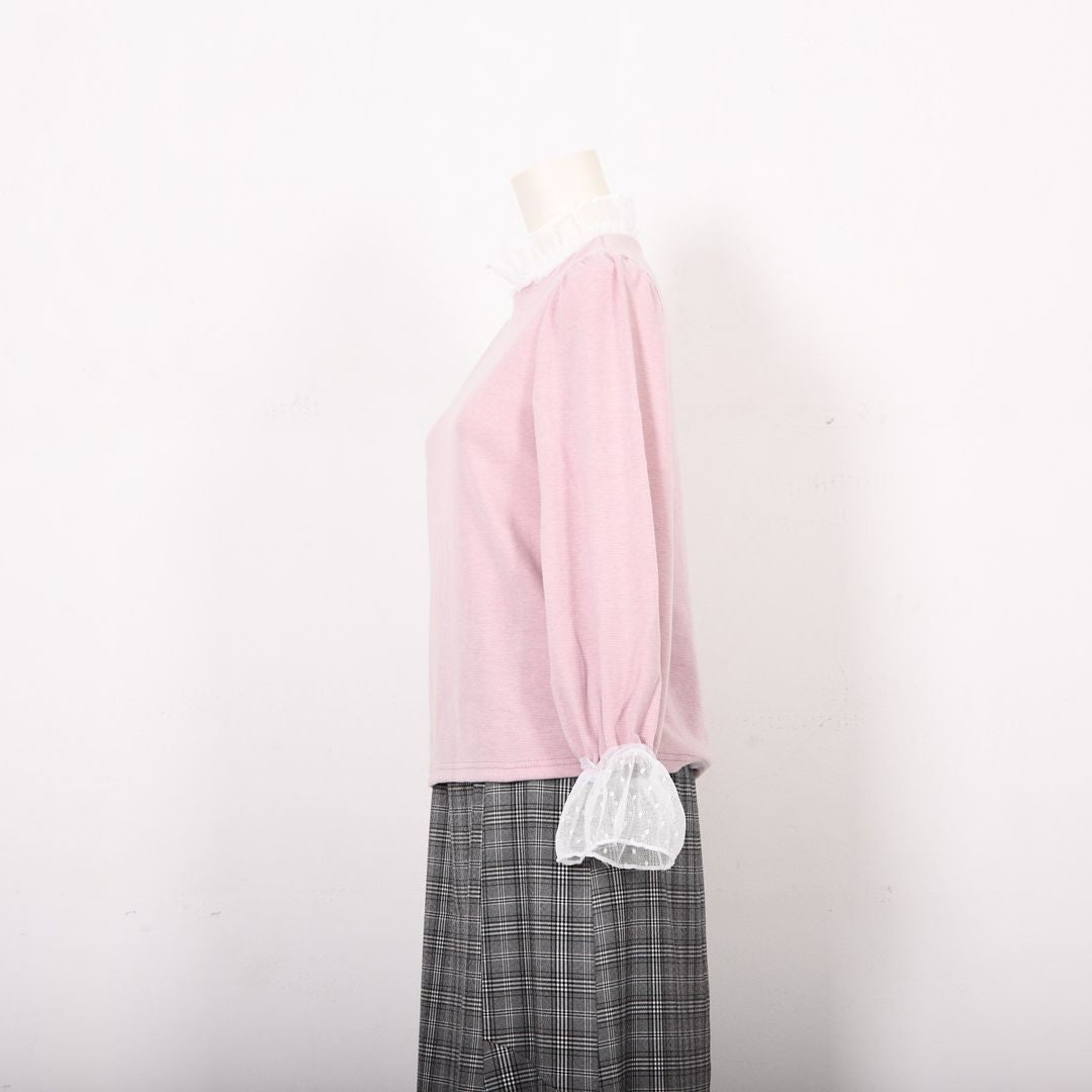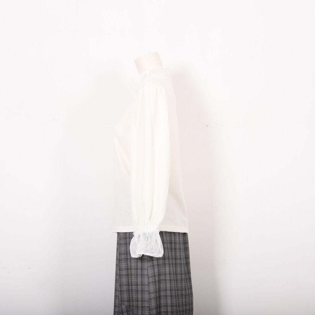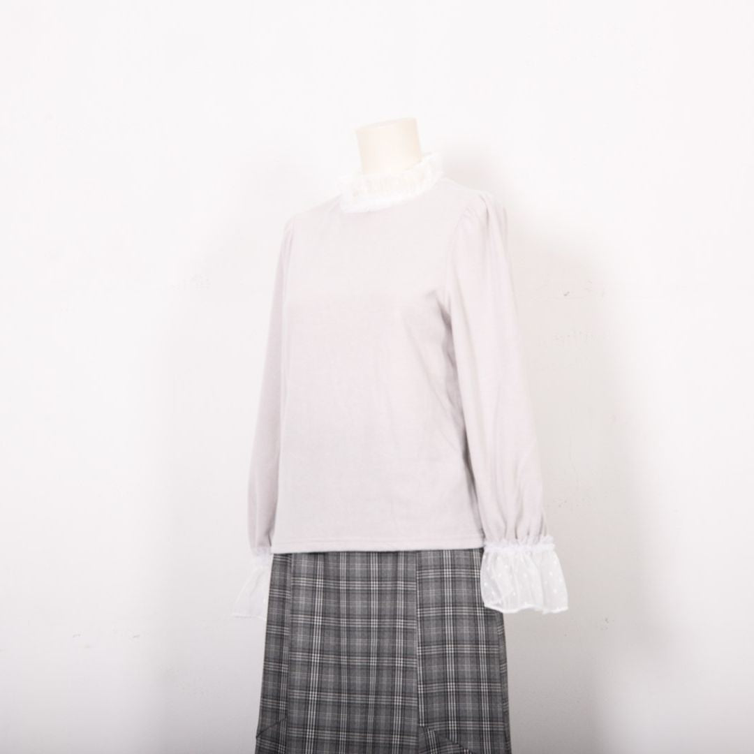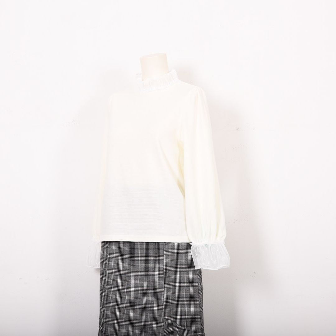 ふんわりとした衿元や袖口フリルが甘さをプラスします。