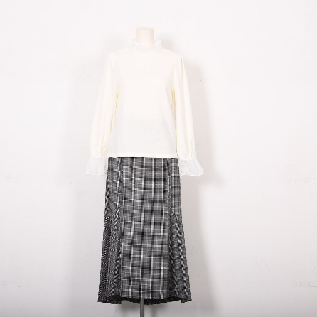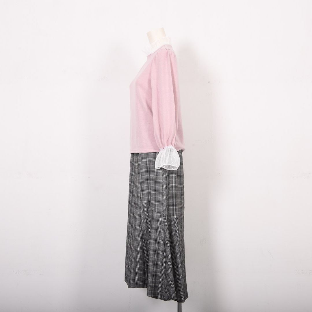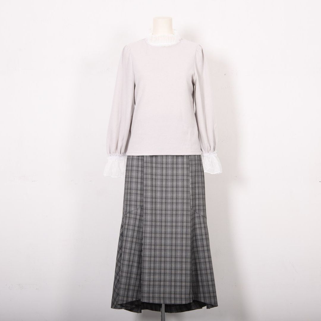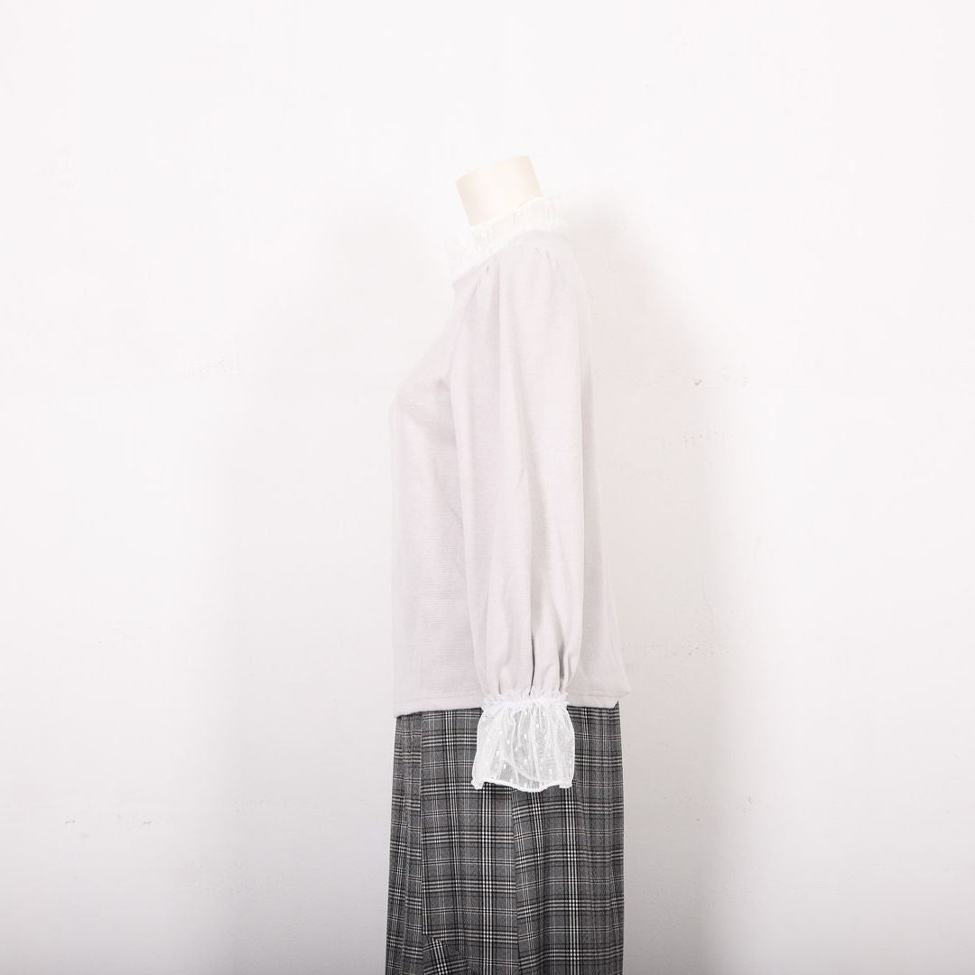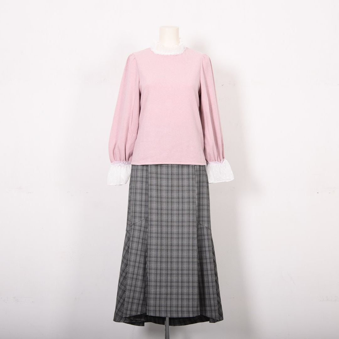 ふんわりとした衿元や袖口フリルが甘さをプラスします。