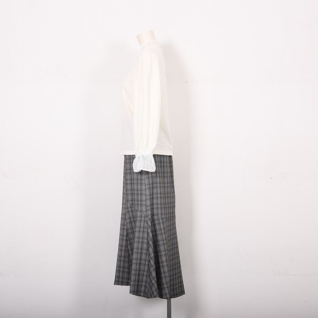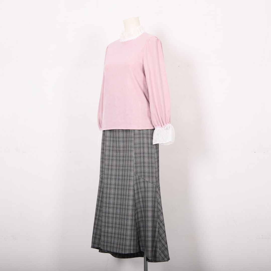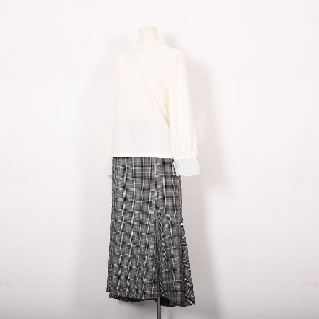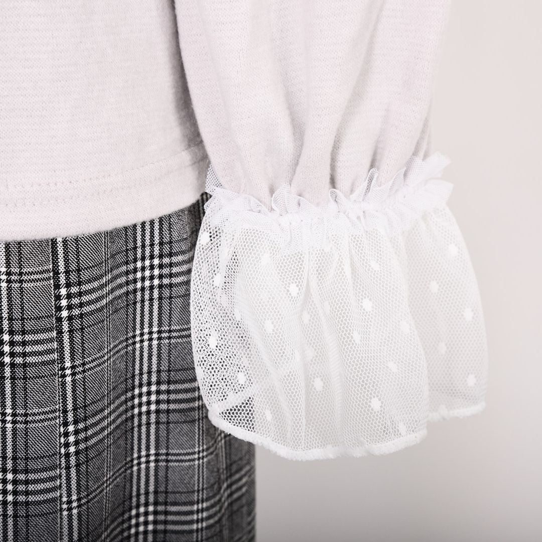 ふんわりとした衿元や袖口フリルが甘さをプラスします。