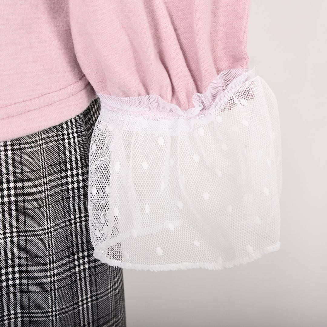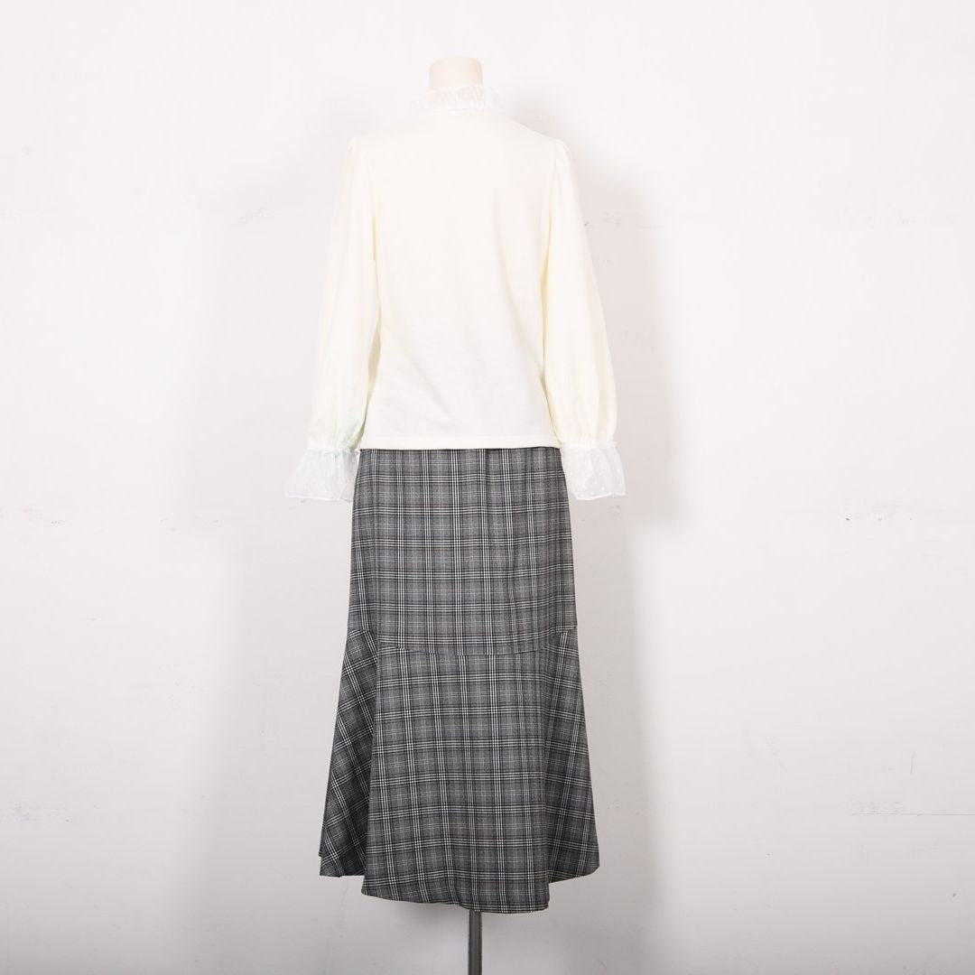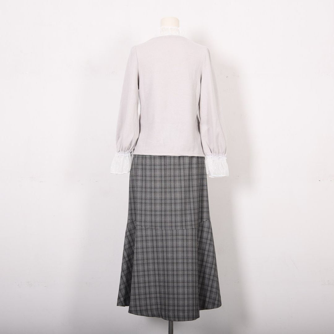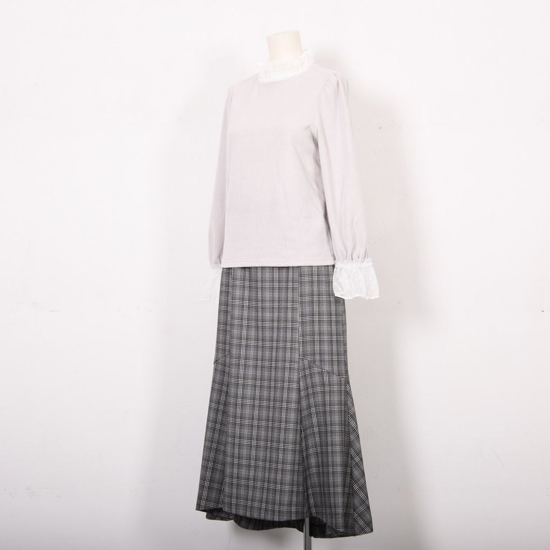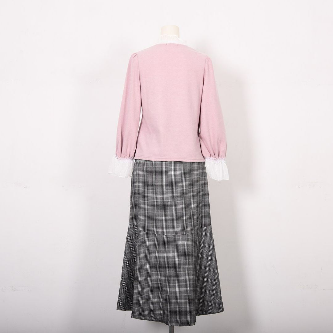 ふんわりとした衿元や袖口フリルが甘さをプラスします。