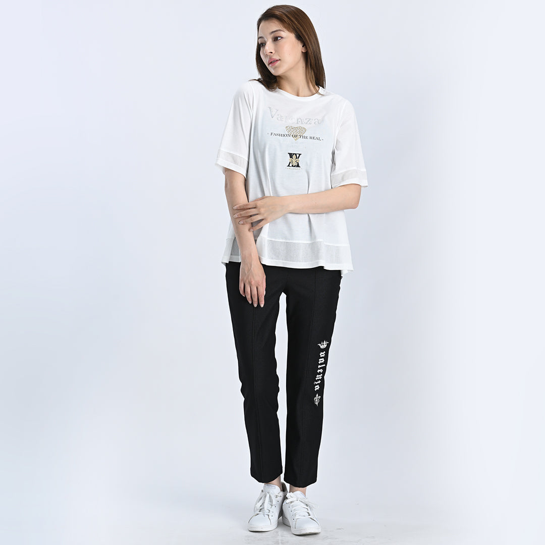 ジャケットやカーディガンとレイヤードしてもフロントデザインをアクセントにコーデが格上げされます↗