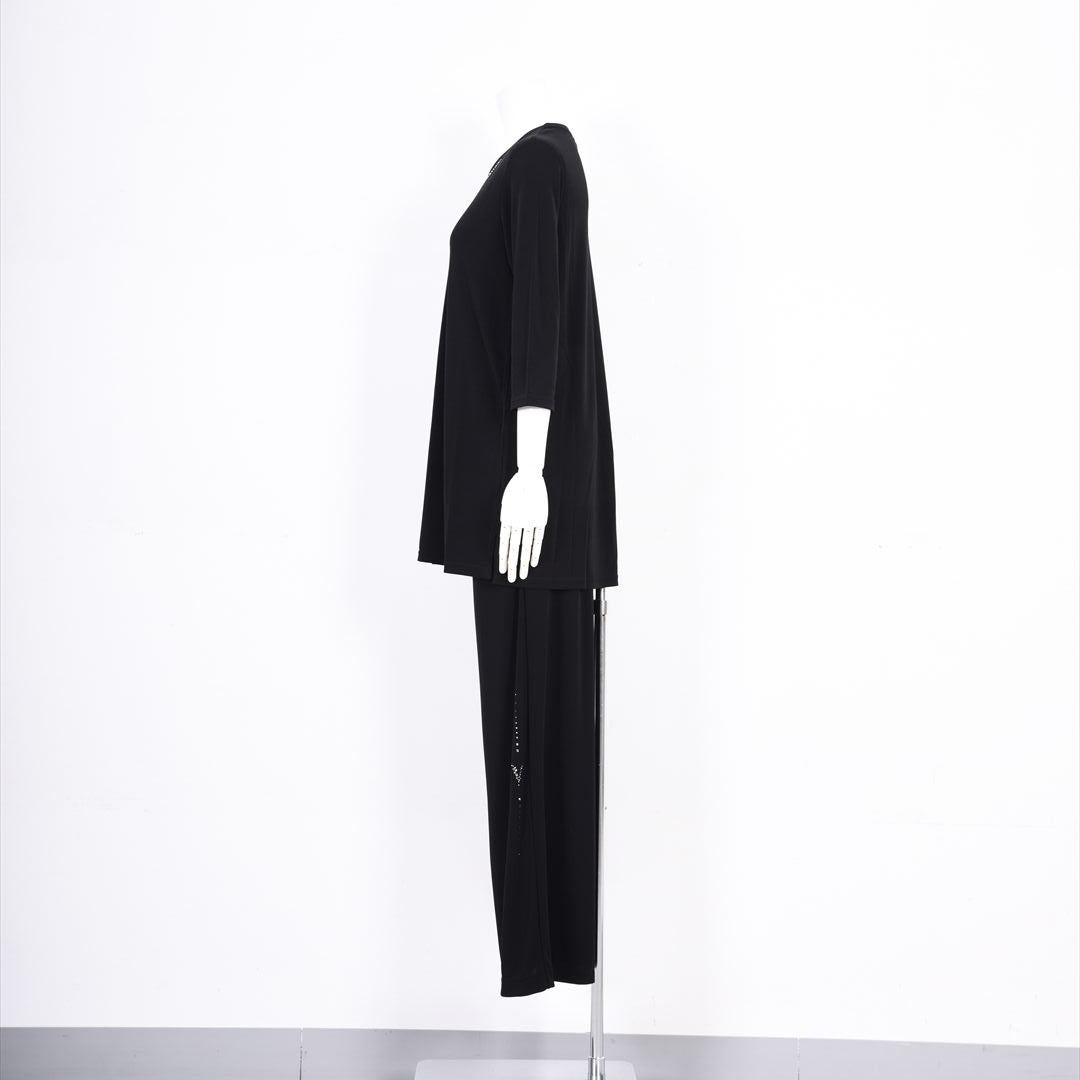 ラインストーンがネックレスのように見える!!とっても華やかですね♪人気の涼感素材で着ている間は涼しく快適でした♪着丈は太ももにかかるくらいのロング丈。袖丈はヒジがすっぽり隠れる7分袖。(158cm/40号)
