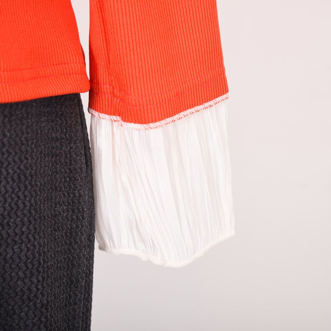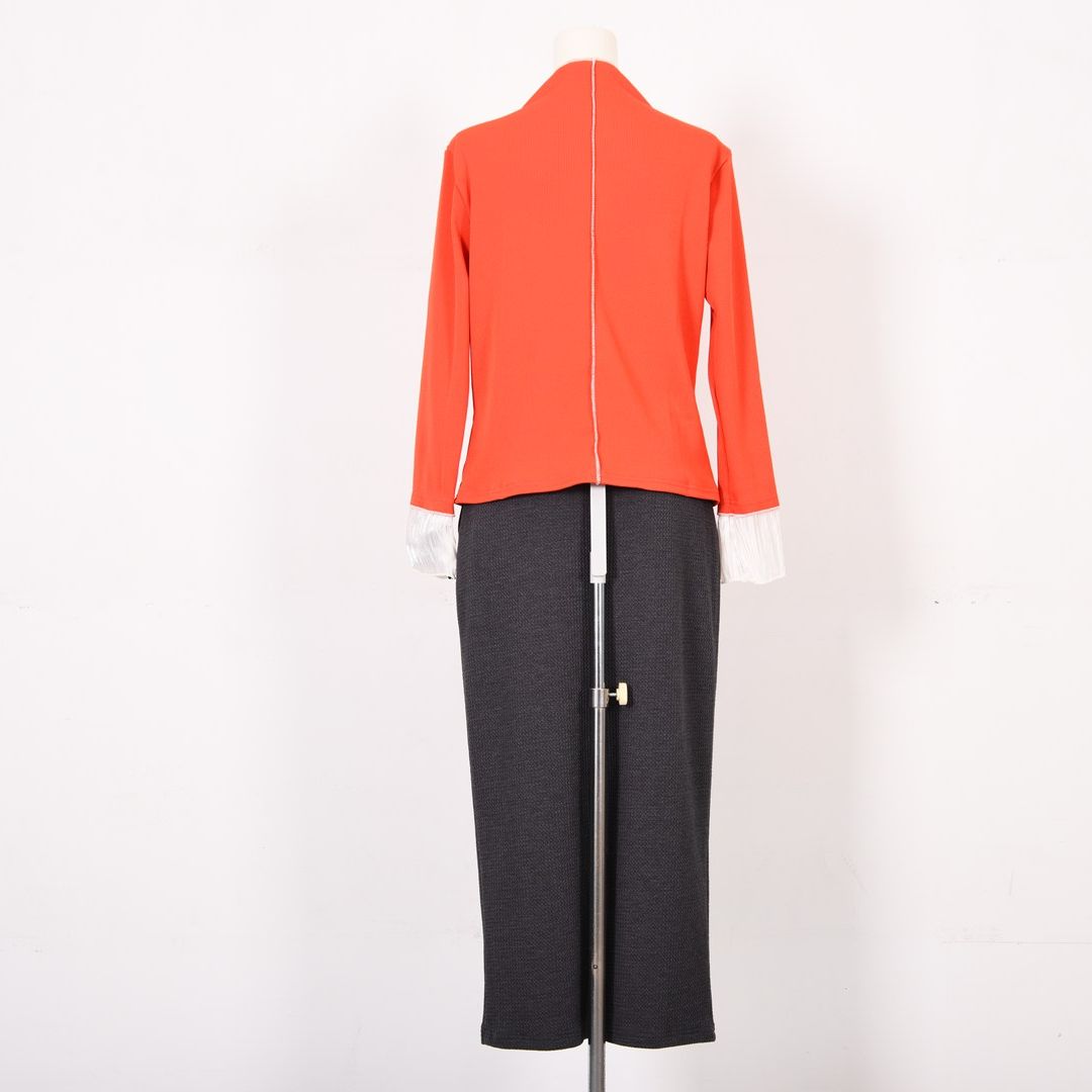 シンプルでありながら身頃の切り替えやレイヤード風のお袖など、さりげないアクセントに注目です。
