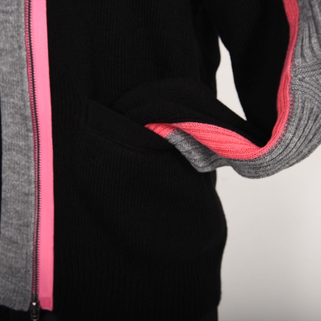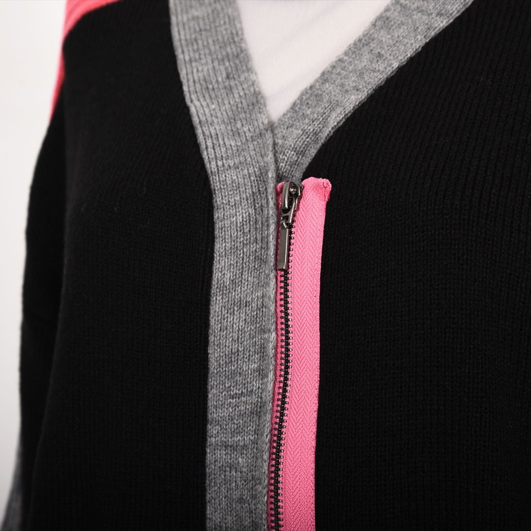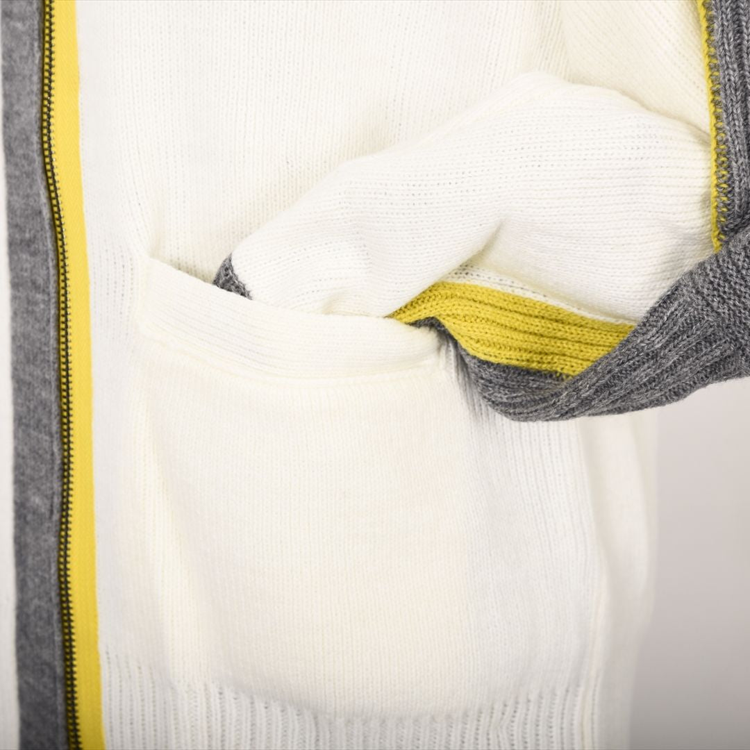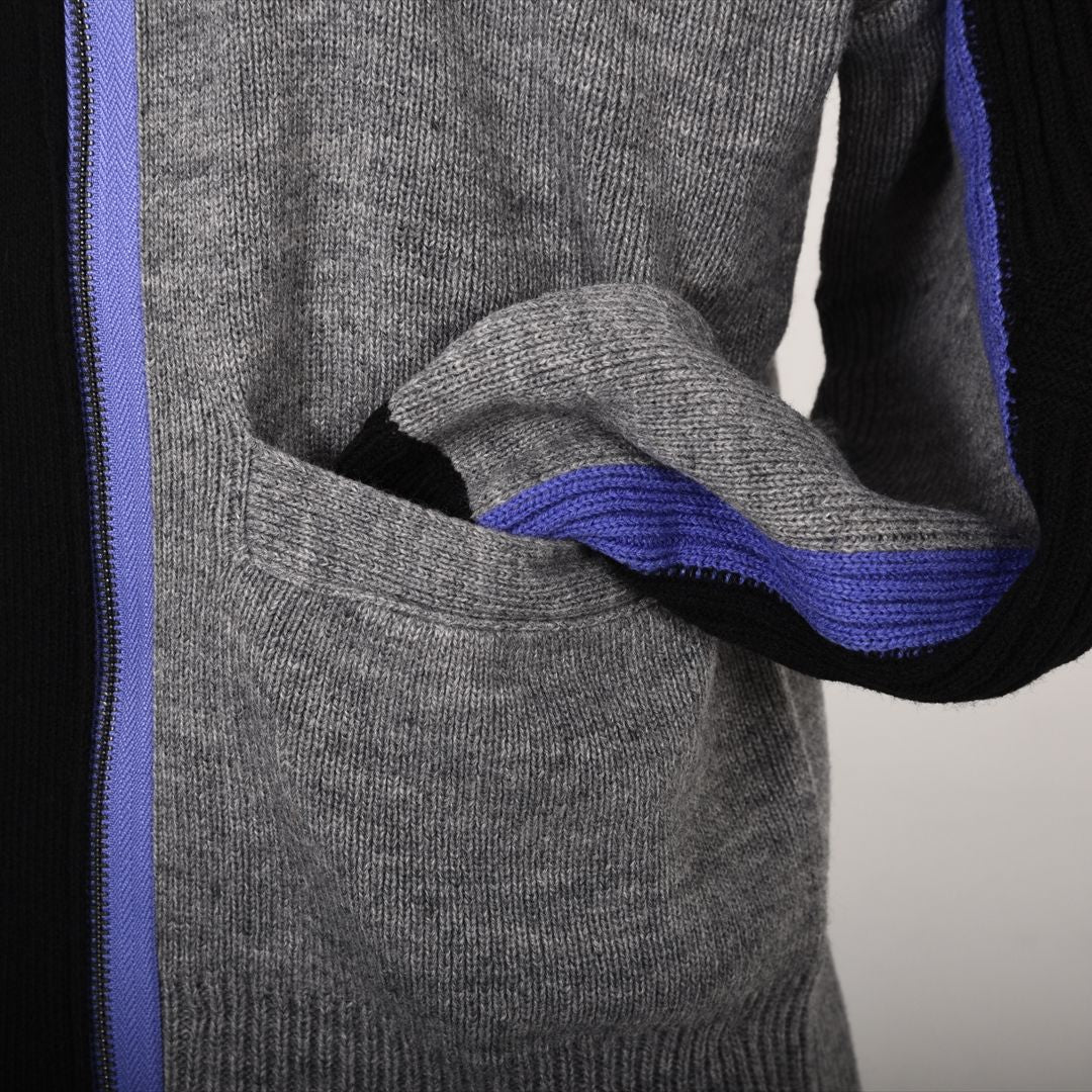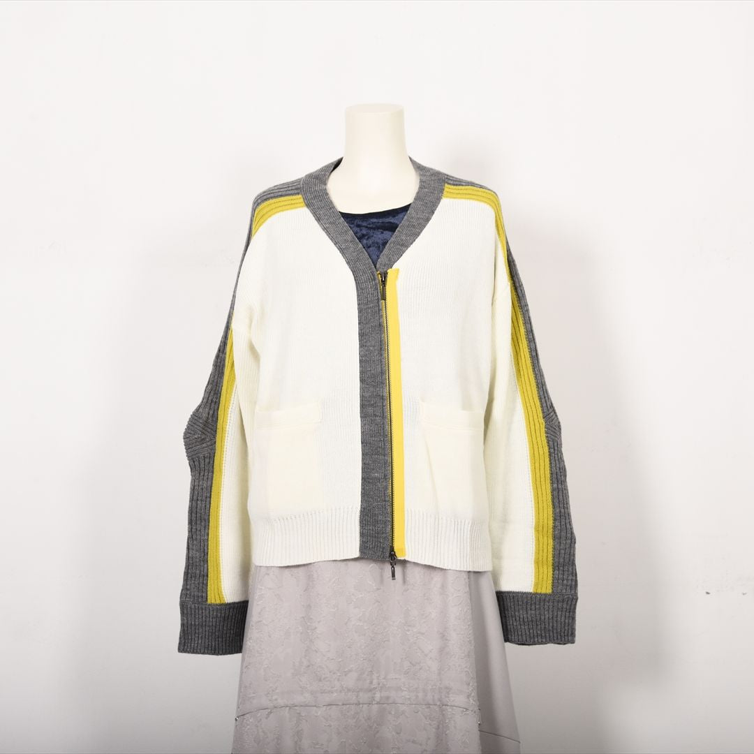 ジップを開け閉めすることでニットとしてもカーディガンとしても着回し自在なアイテムです。