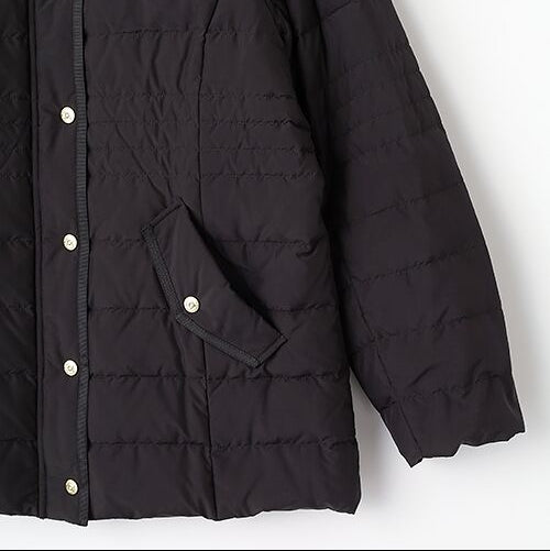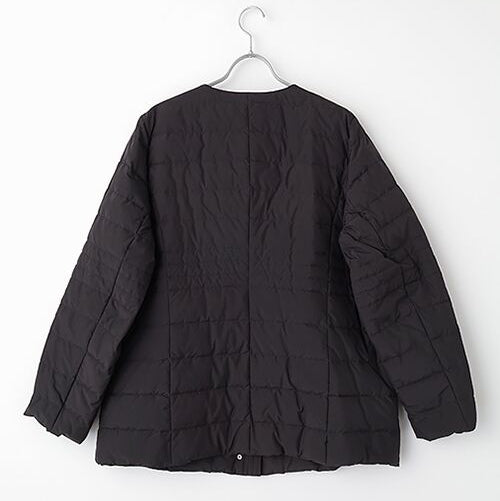 すっきりとしたノーカラーデザインで優しいフォルムを意識したダウンジャケット。