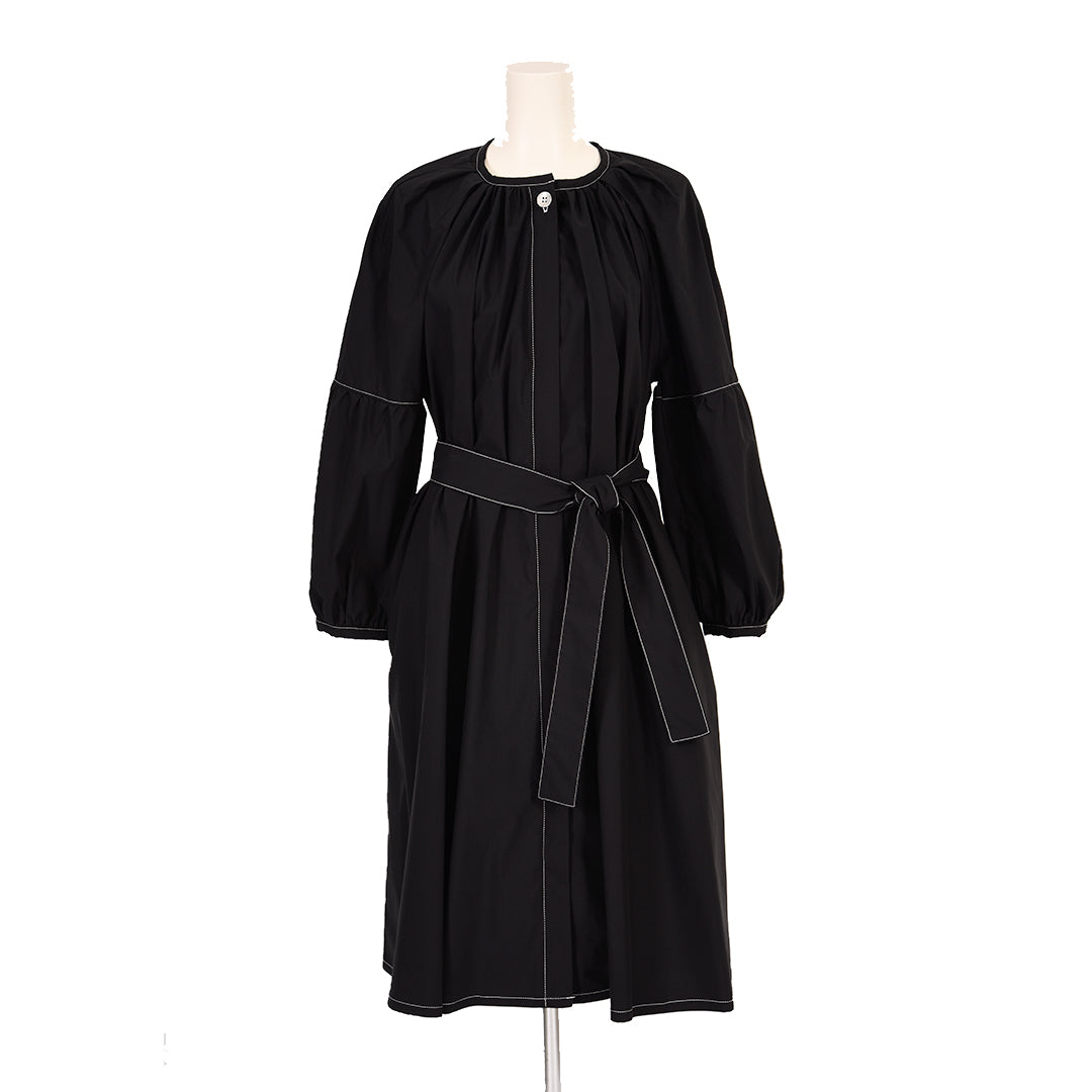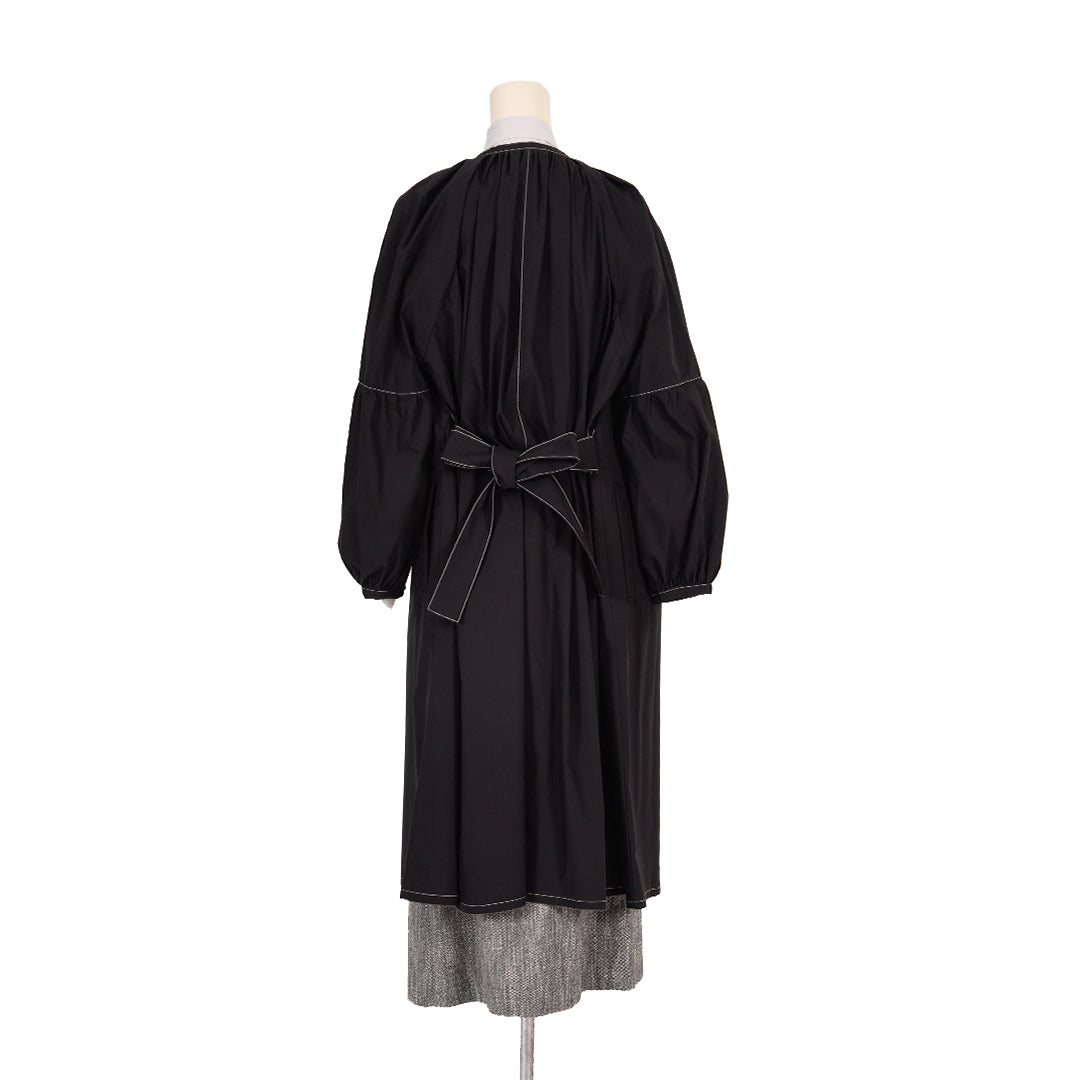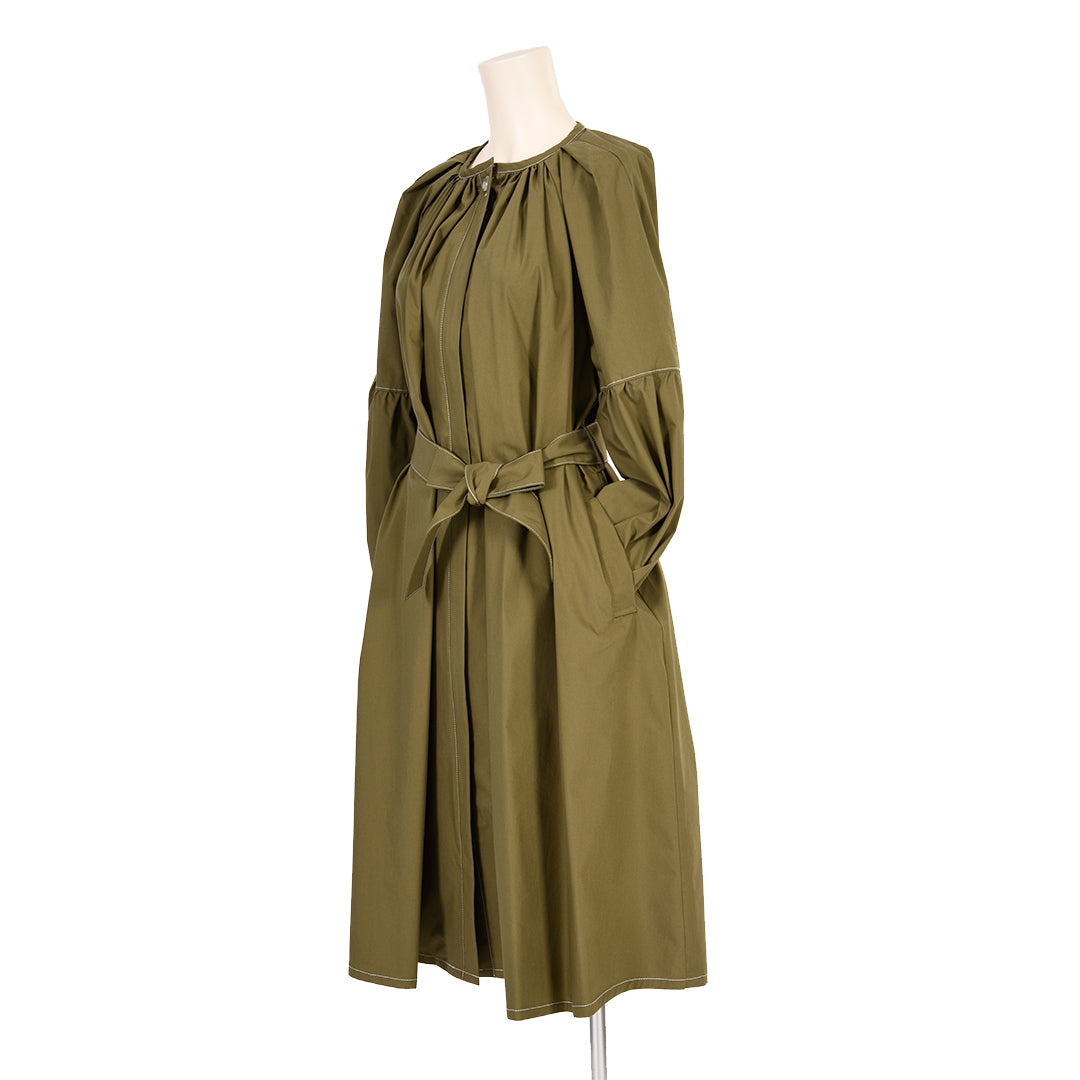 前身頃のジップアップと首元のシルバーボタンがアクセントのノーカラーコート。