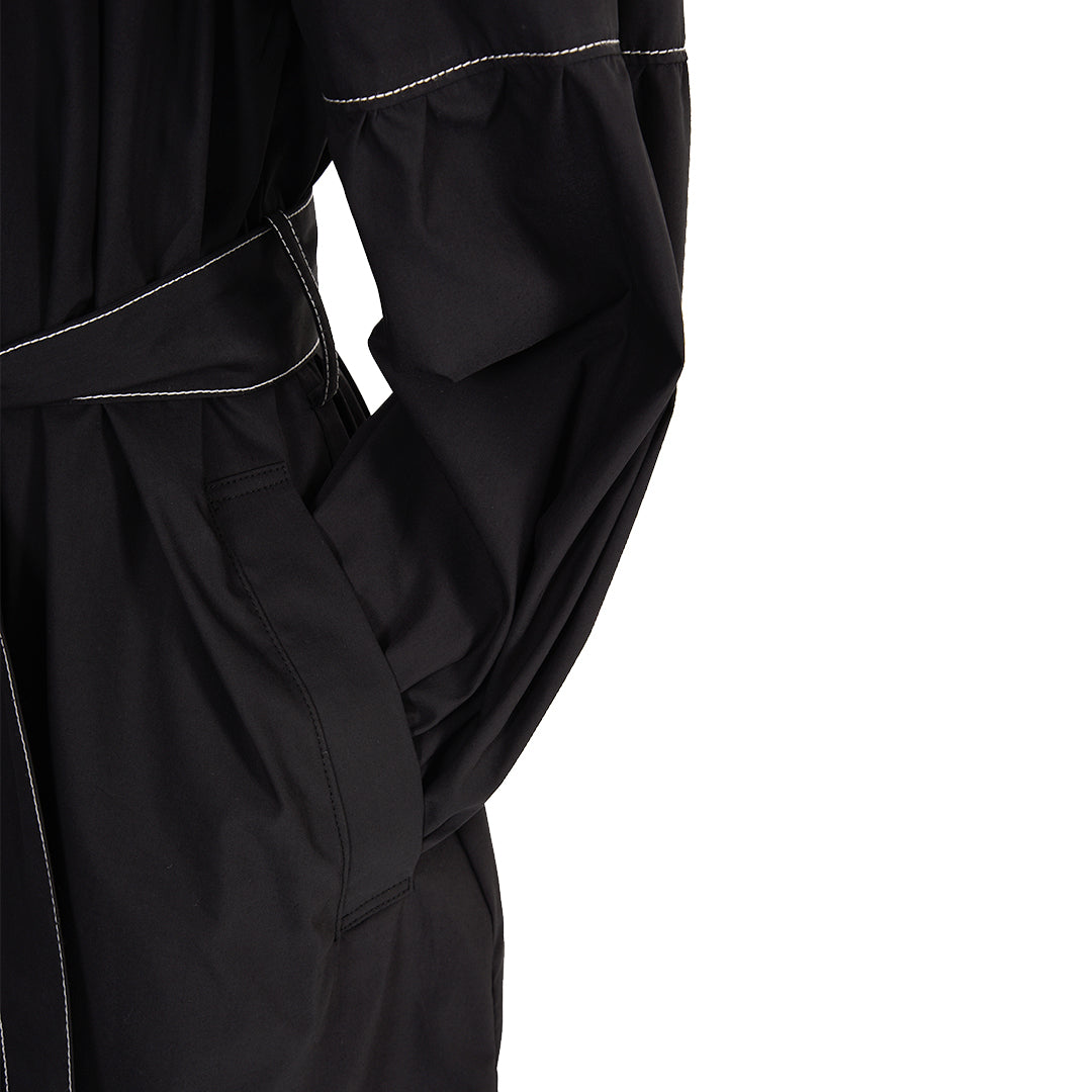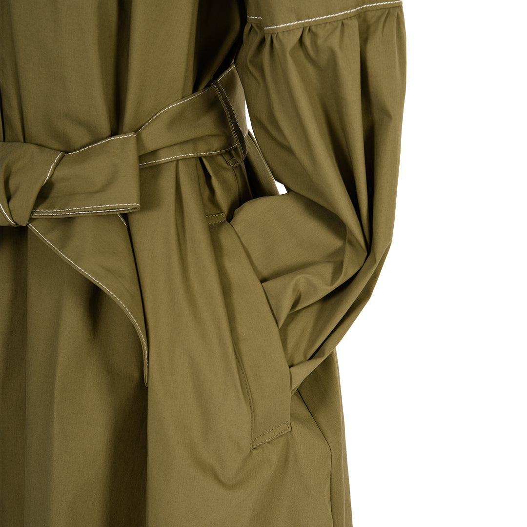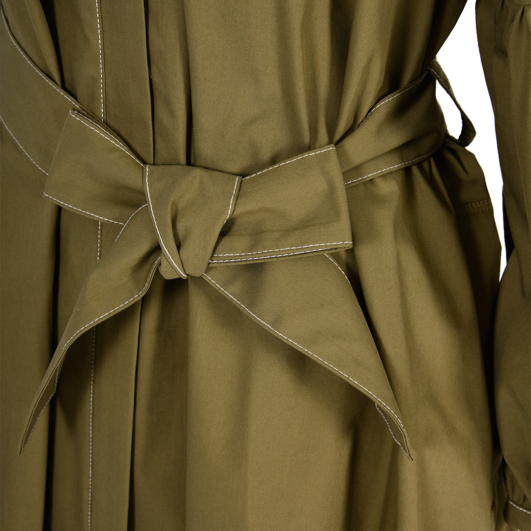 前身頃のジップアップと首元のシルバーボタンがアクセントのノーカラーコート。